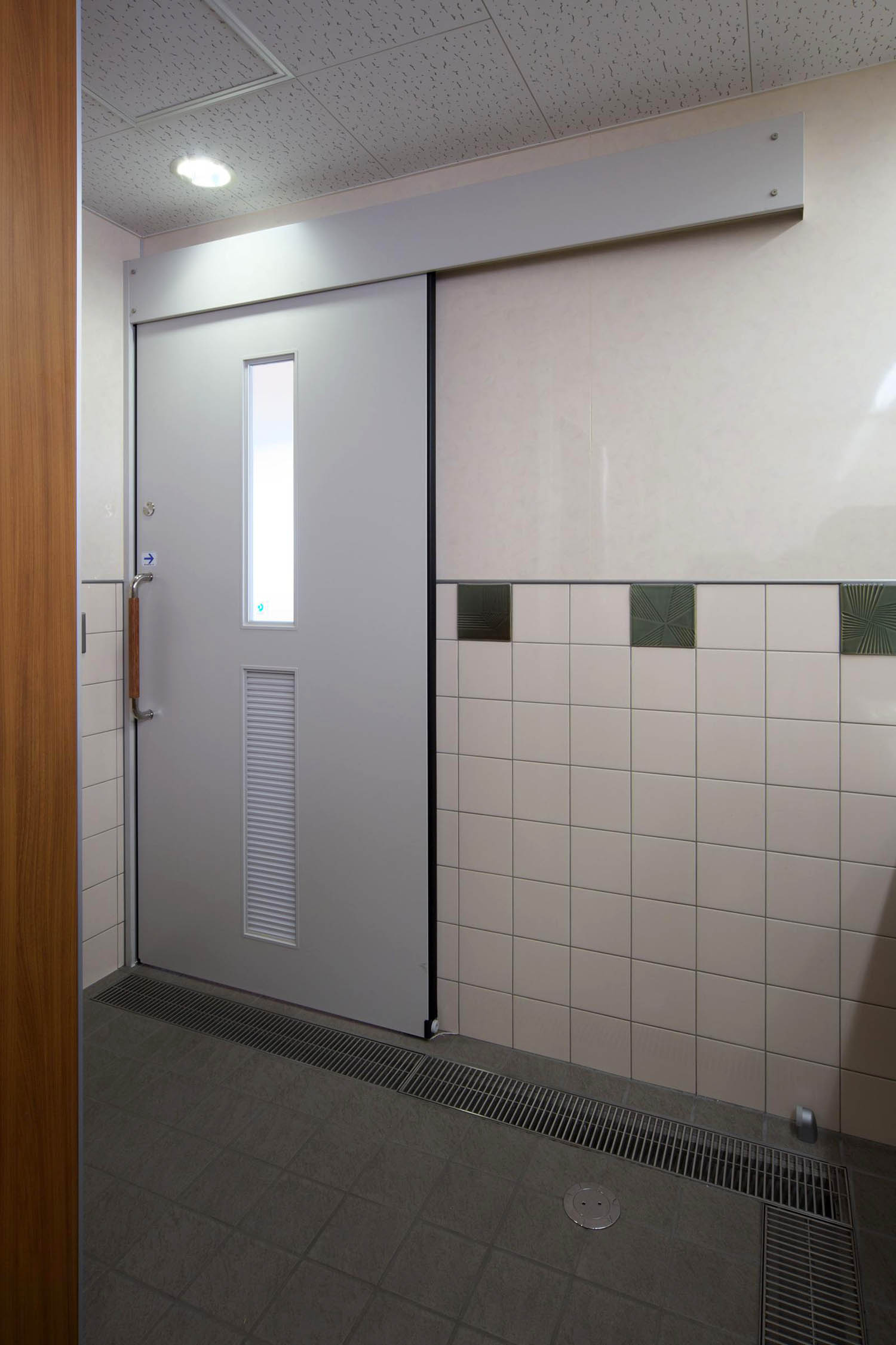 トイレ入り口に設置したドアは床レールが無く、軽い力で開く自閉式のバリアフリーに対応したカームドア。