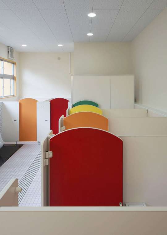 扉は、子供たちが楽しく利用できるようなカラーで、上部をアーチ状にしたトイレブース。