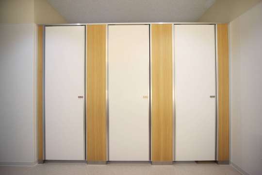 個室を仕切るパネルは30mm厚のパーティクルボードを採用し、非常に堅牢性の高いトイレ空間となっております。