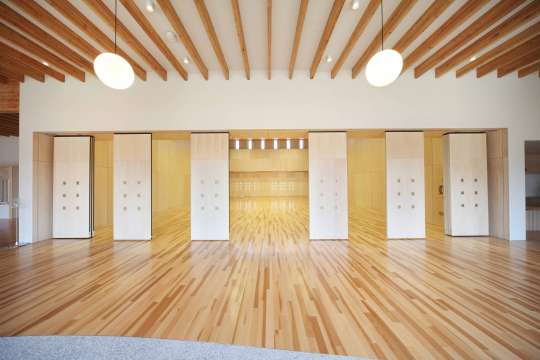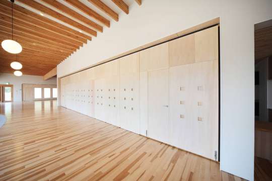 ホールと通路を仕切るライトリーウォールは12枚のパネルで構成し、表面材にシナ合板を、さらに木製の切窓をパネル1枚につき6箇所配置しました。木の温かみが感じられる空間に仕上がりました。