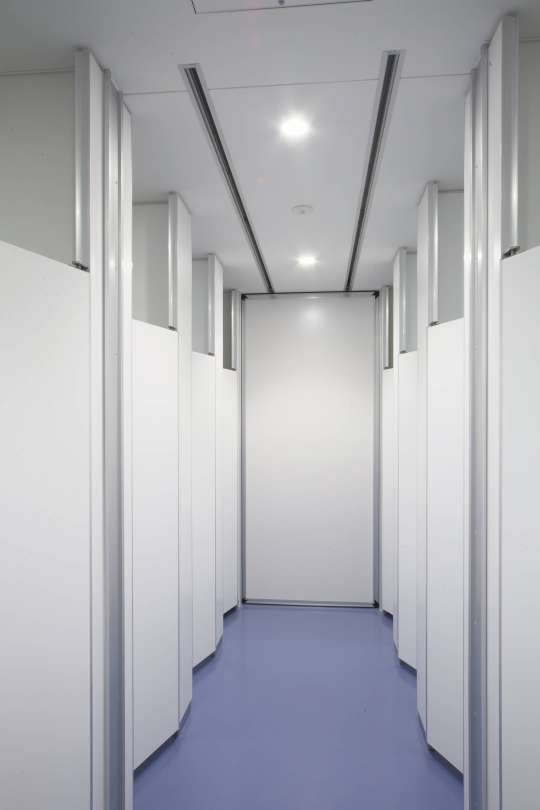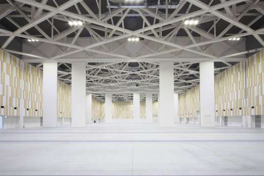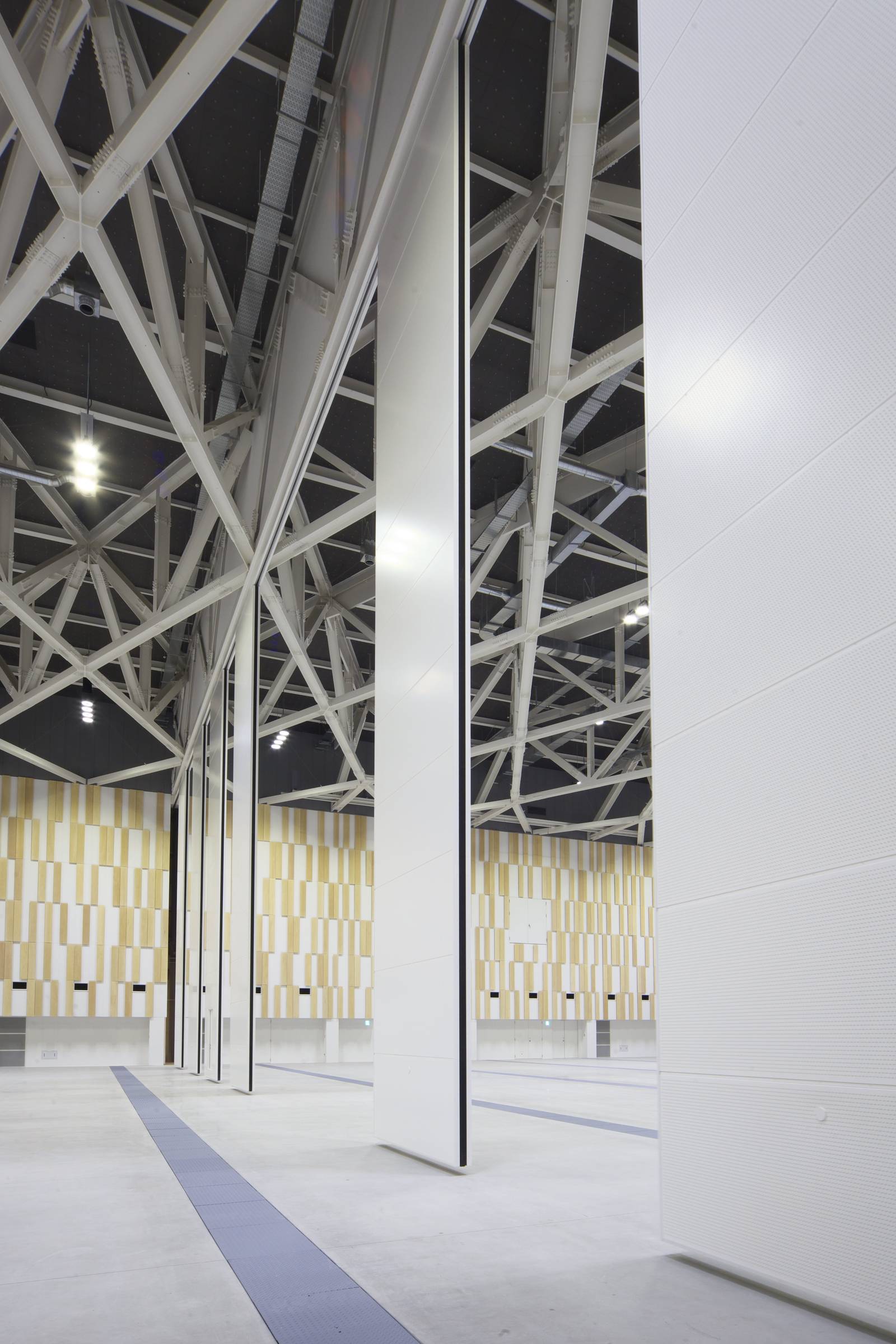 移動間仕切の小松ランニング。高さが約12mのフラッシュパネルとパンチングパネルを交互に16枚並べ、幅約42mの小松ランニングがイベント会場を3分割します。