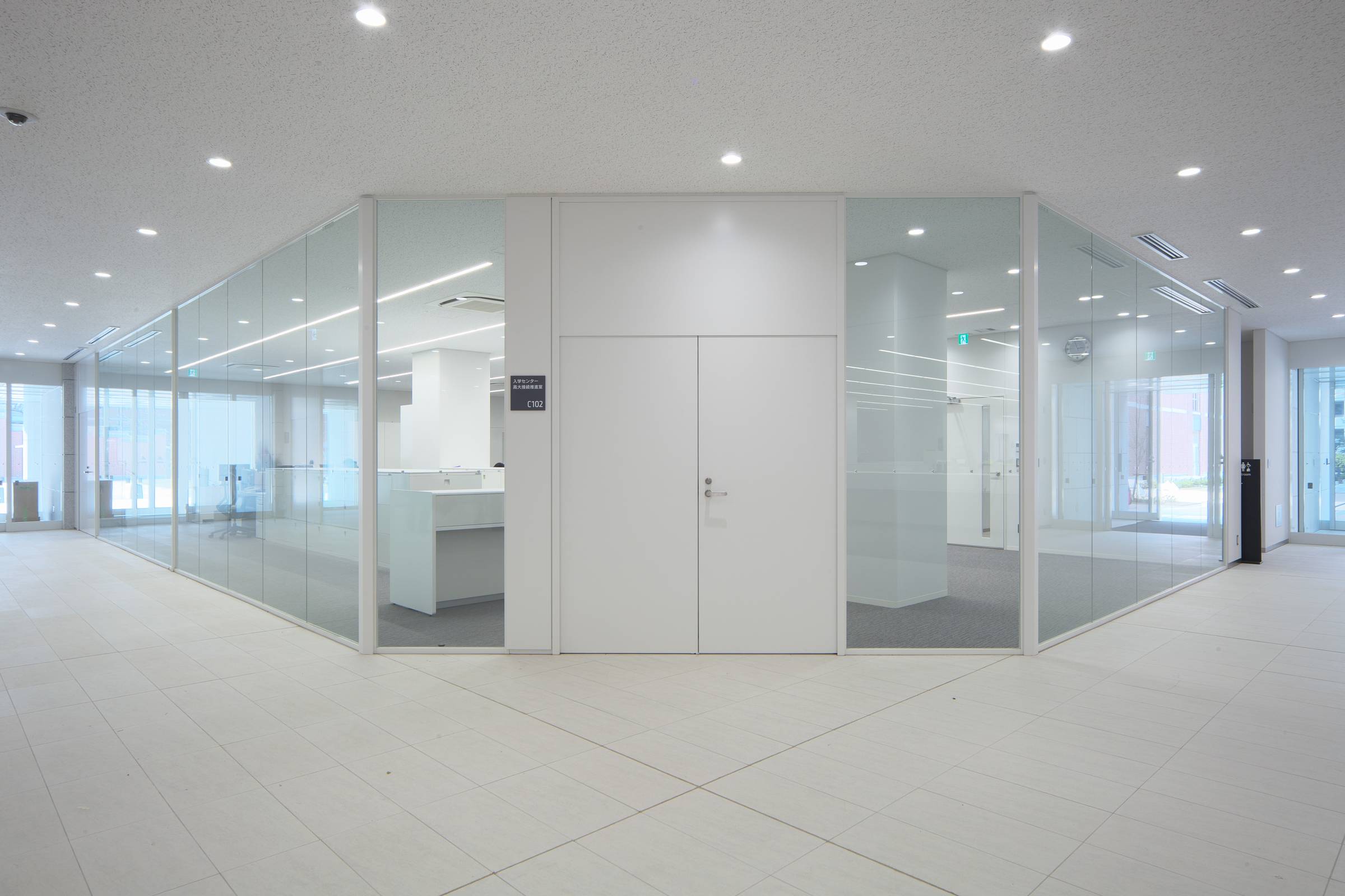 フレームのない遮音タイプのガラスパーティション。