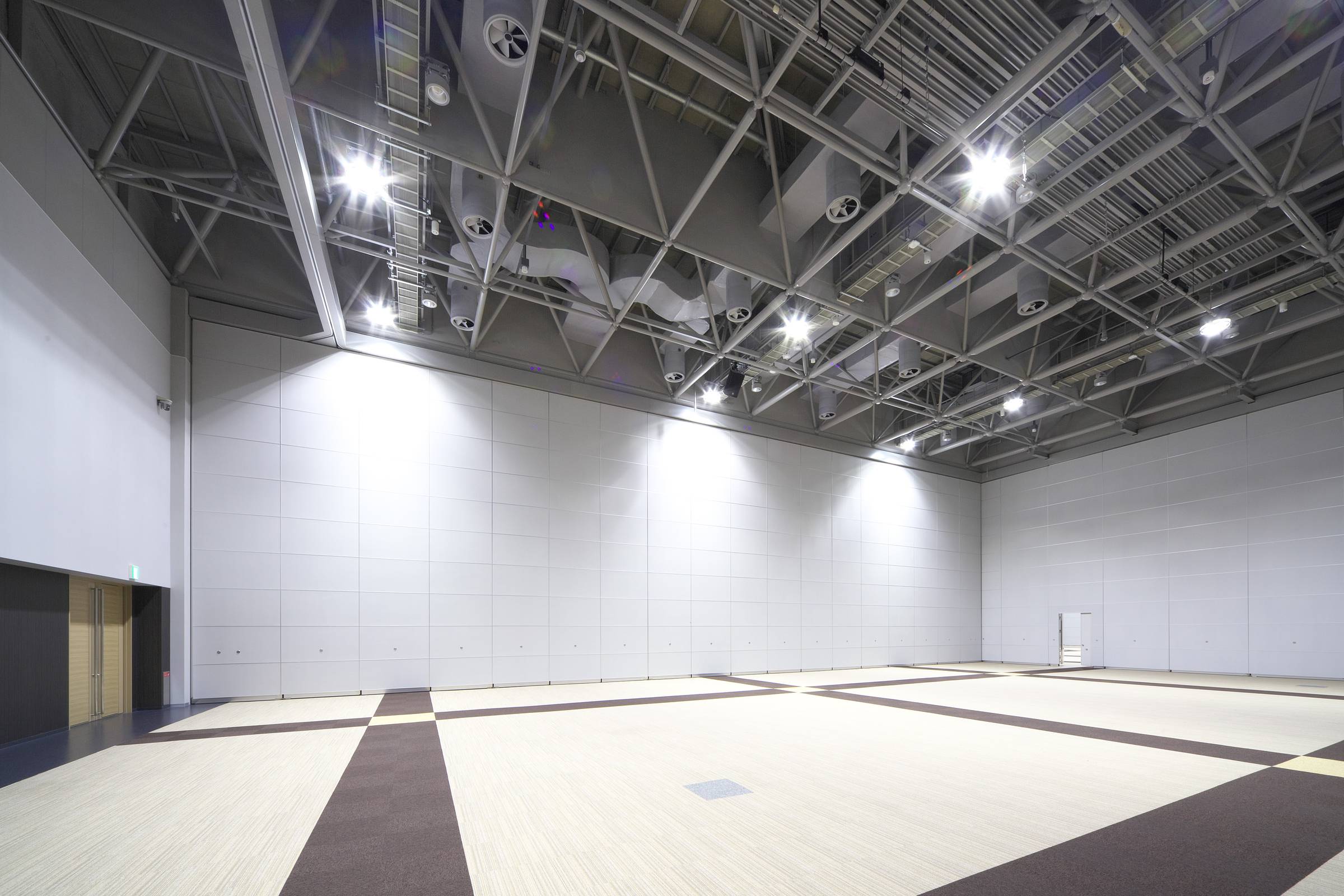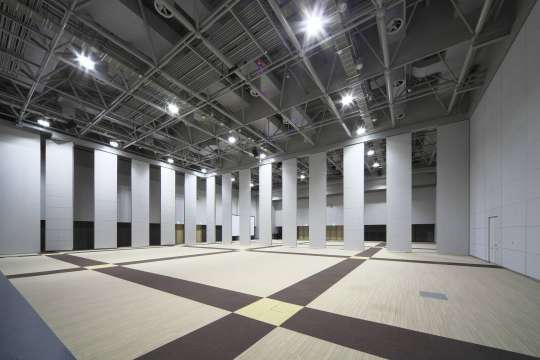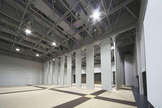 左右幅約35m、奥行き方向は約84m、 床からレールまでの高さ約8.4mの広大な展示会場を間仕切ります。R形カーブレールにより大型の重量壁も楽に方向転換が可能です。