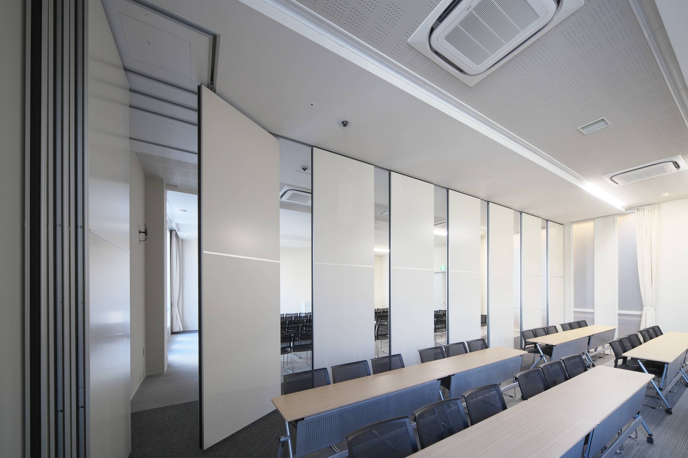 天井高約4m、幅約18mの会議室を二分します。