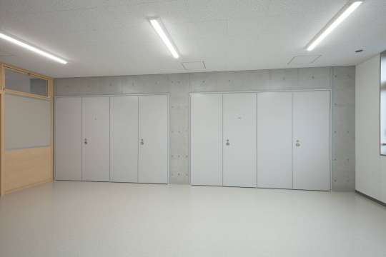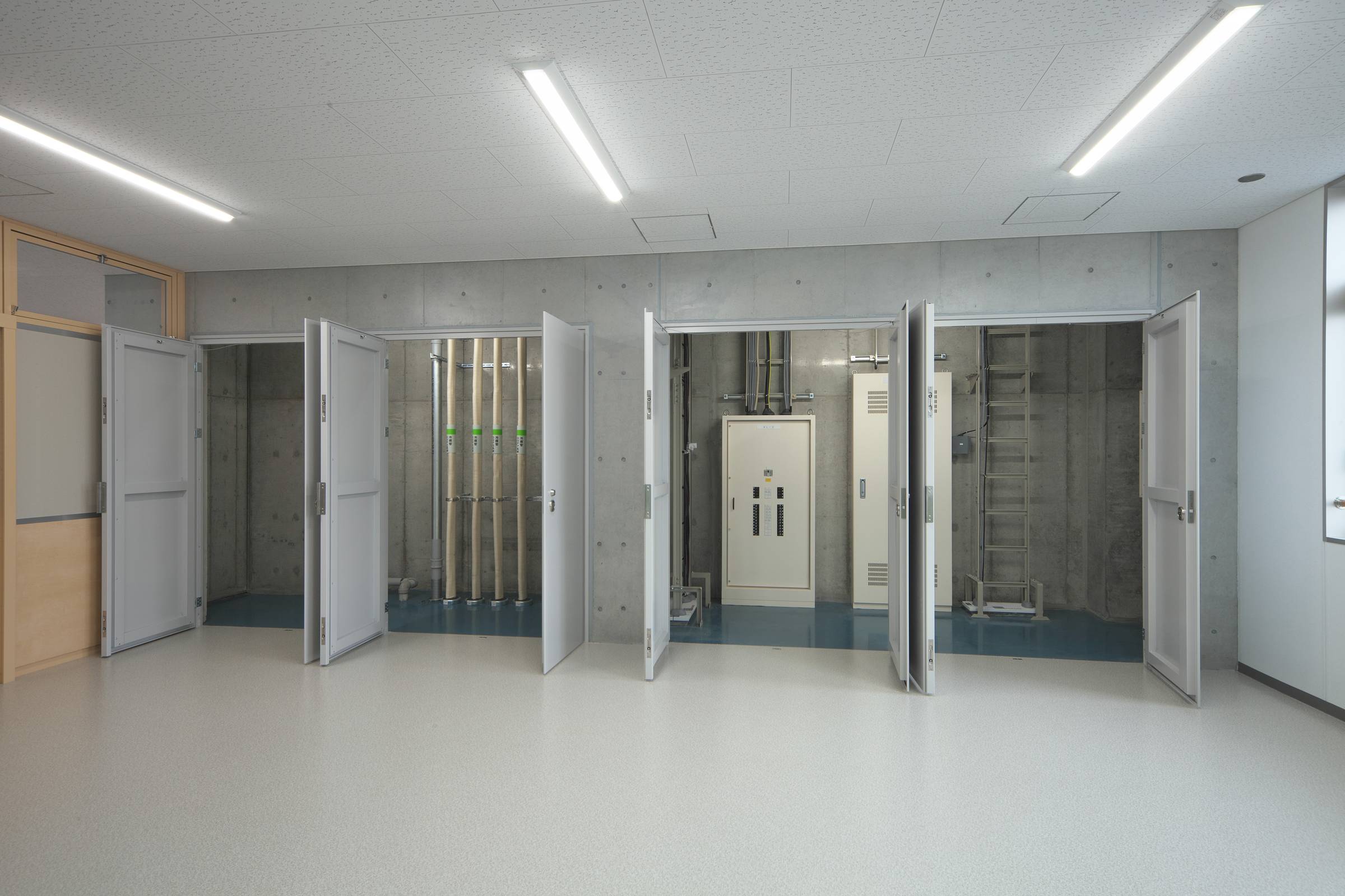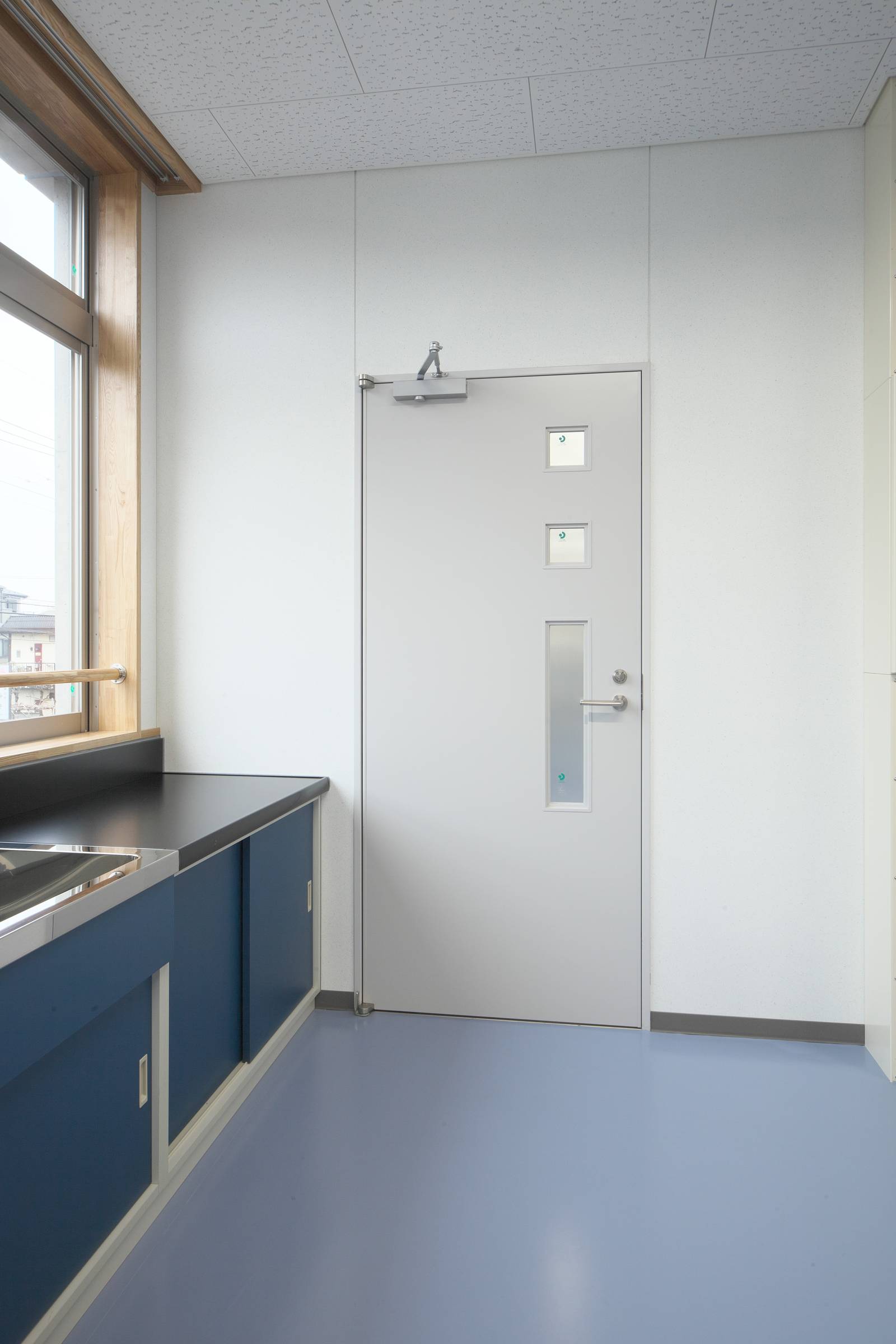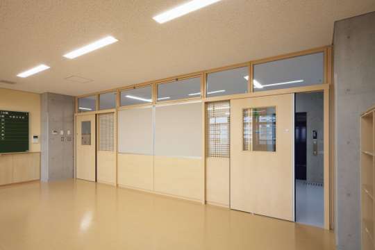 出入り口の引き戸には、身長を問わず誰にでも容易に手をかけられるストレートハンドルを採用しました。パネルには木目調鋼板を採用し、温かみのある学校空間に仕上がりました。