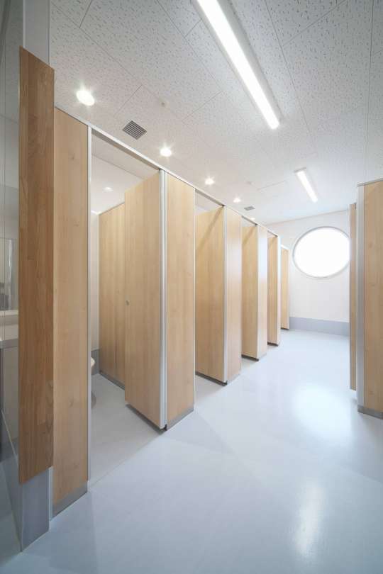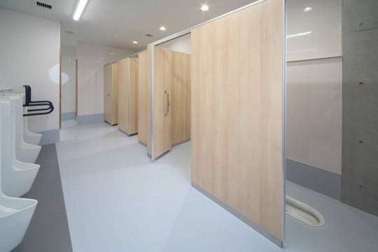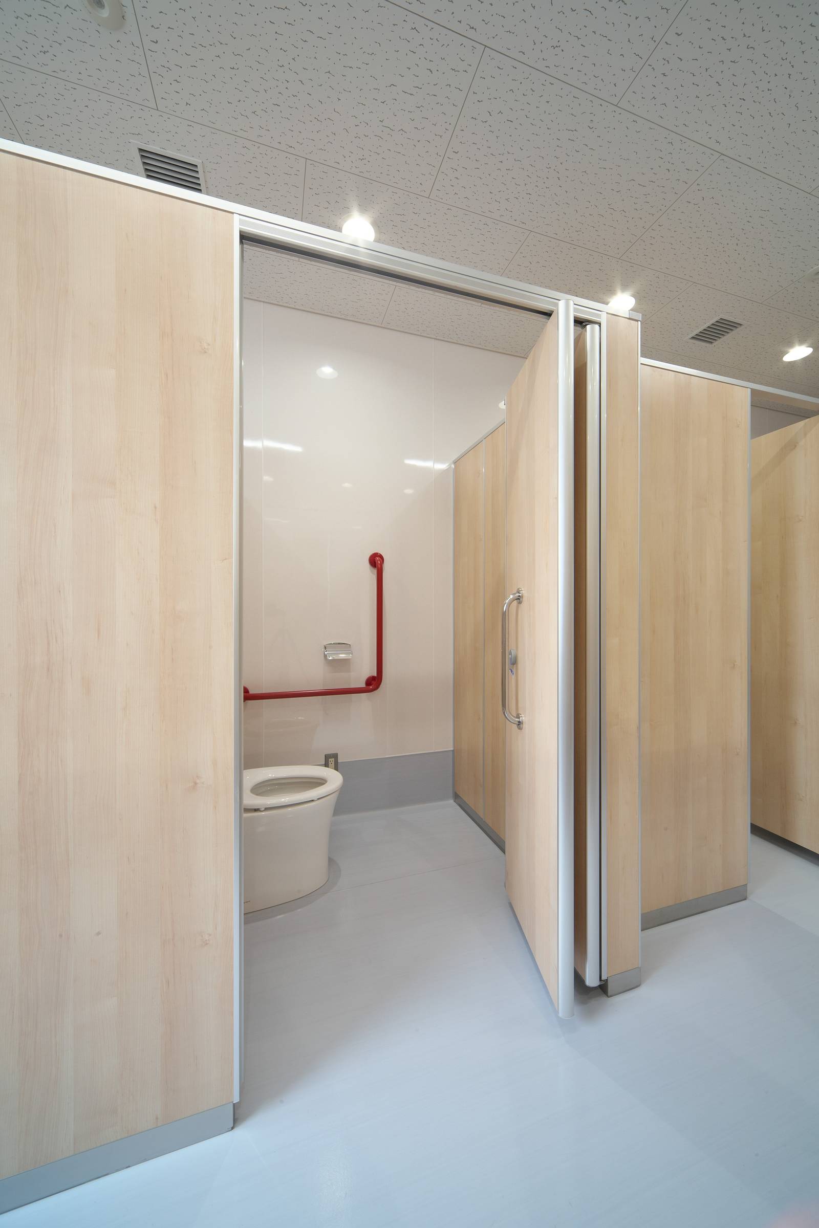 ビスの見えない美しい曲面のアールエッジを採用したトイレブースです。一部、車椅子の方でも容易に開閉できる折り戸タイプを採用し、バリアフリーにも対応しています。