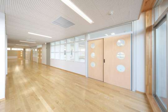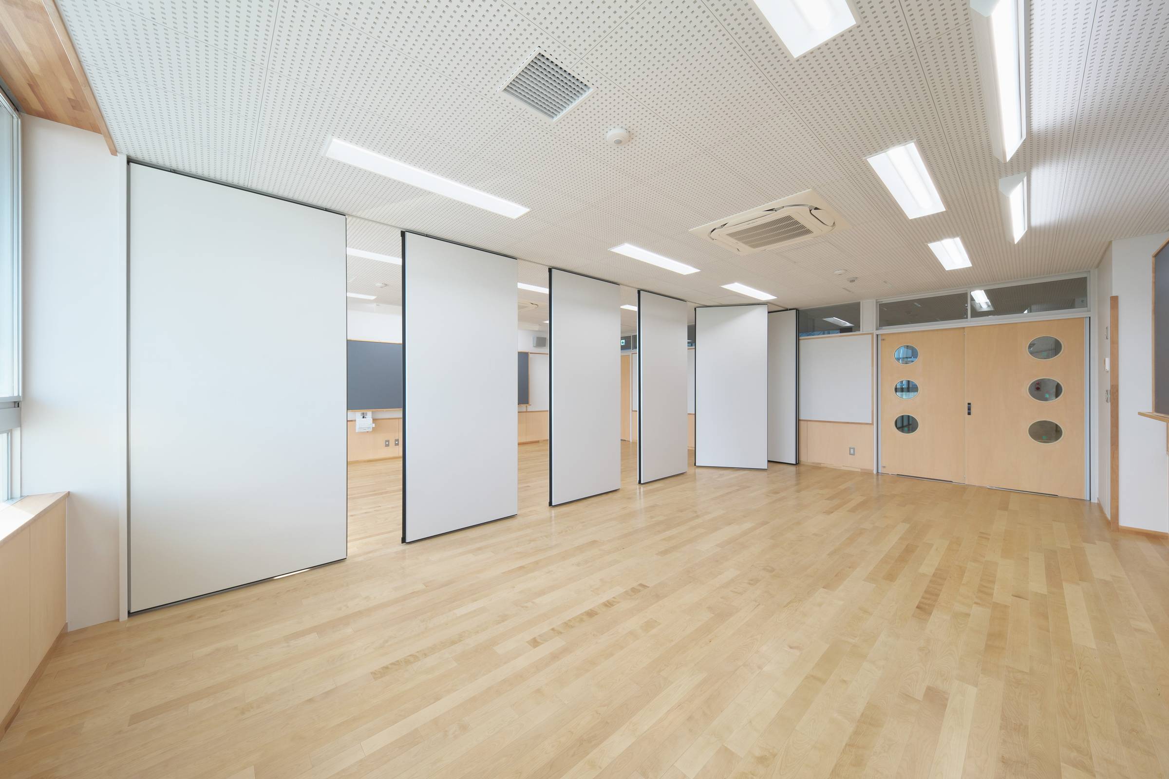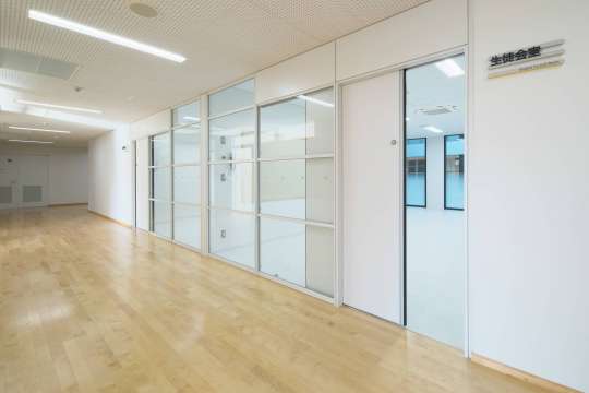 引き戸、サッシ、スチールパネル枠を連結し教室・廊下間を間仕切りました
