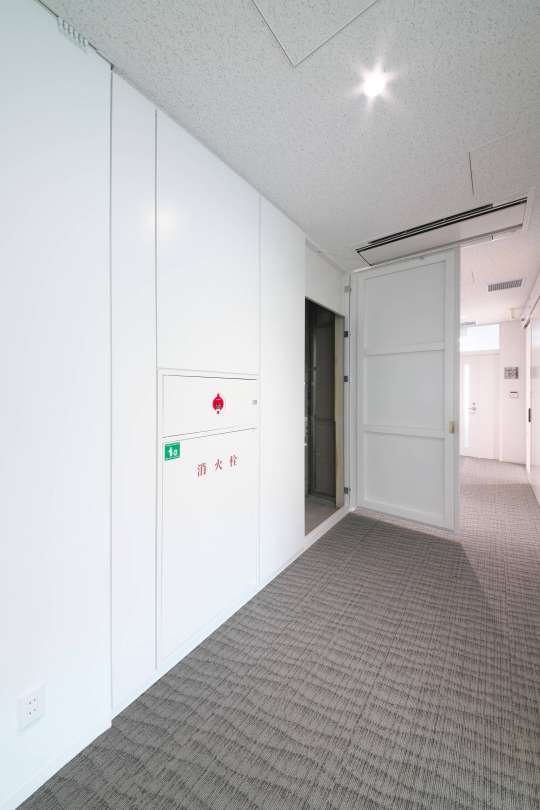 壁面装飾パネルに消火栓ボックスと点検扉を組込みました