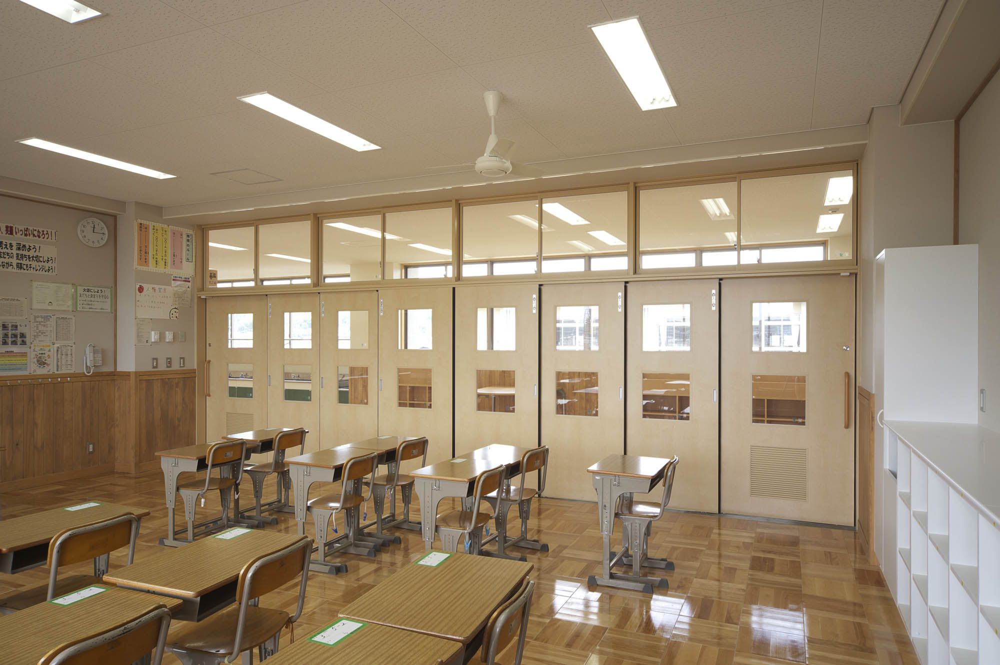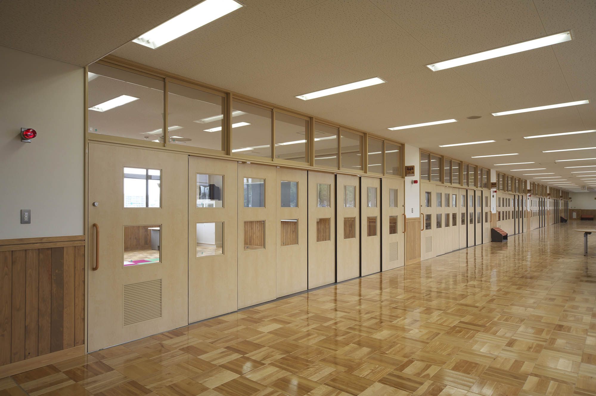 8枚引分け戸タイプの各教室は安全な下レールを採用し、木目鋼板により木の温かみのある雰囲気を演出しています。
