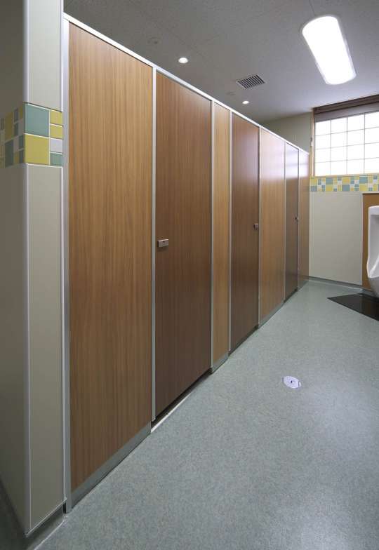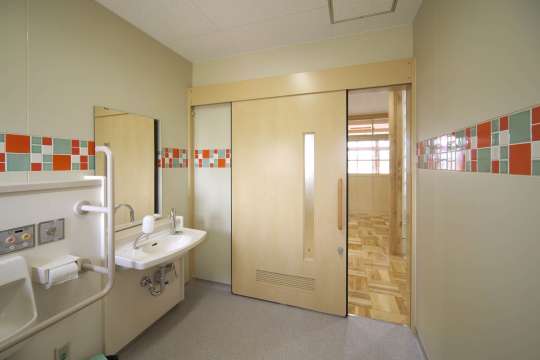 職員用トイレにはシックな木目タイプを、子供達のトイレは明るく開放的な色の扉にしております。
