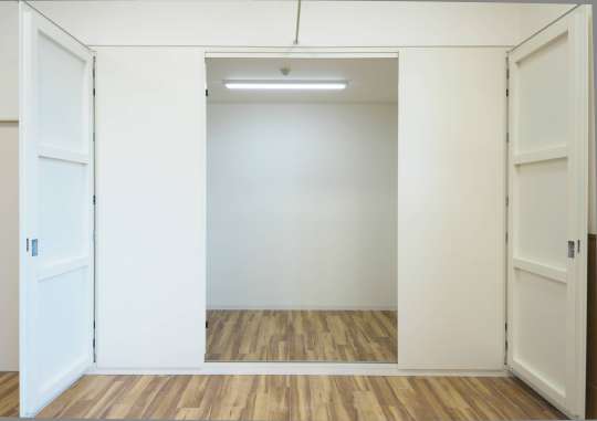 遮音タイプの移動間仕切です一部にホワイトボード鋼板を組み込みました