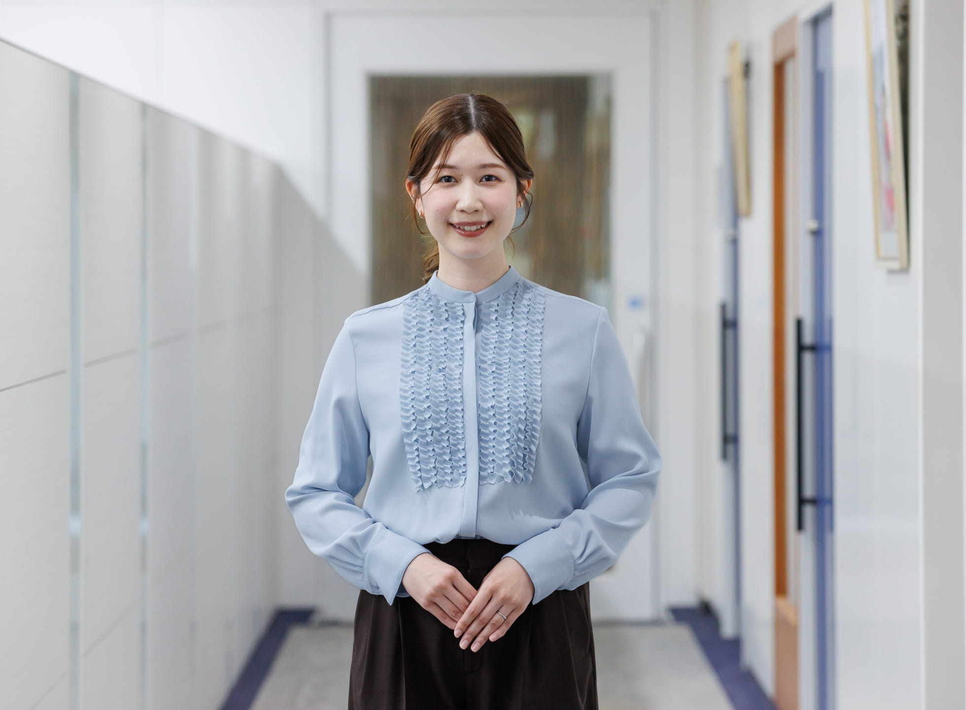 育休明けで復帰した直後でしたが、上司や同僚が温かく迎えてくれ、安心して戻ることができました。今は本社受付を中心に、掲示物管理、備品注文、車両管理など幅広い業務を担当しています。来客対応は会社の第一印象を左右する重要な役割なので、笑顔と気持ちよい接客を心がけています。
