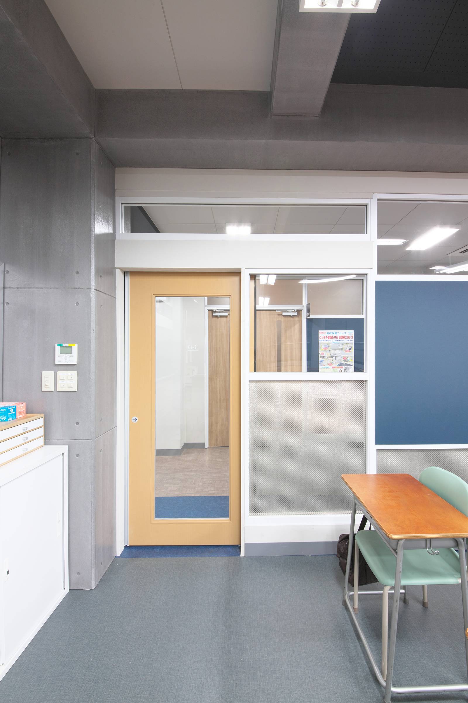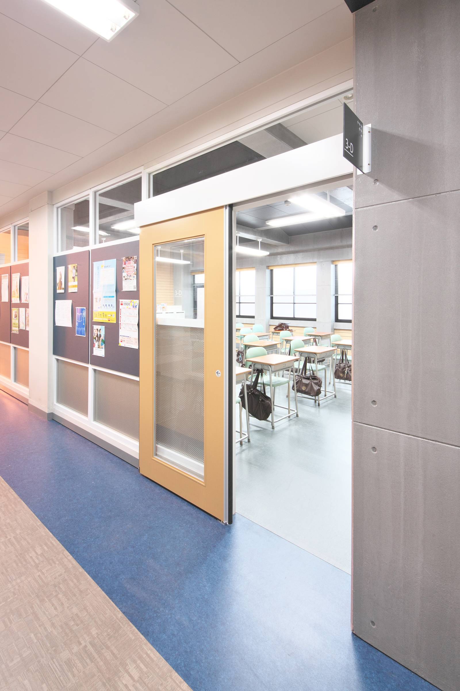 教室の前後出入口のドアに当社の製品カームドアを使用いただきました。
