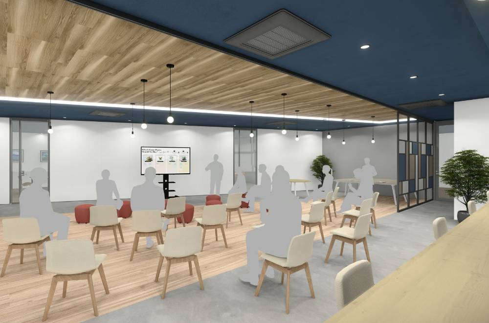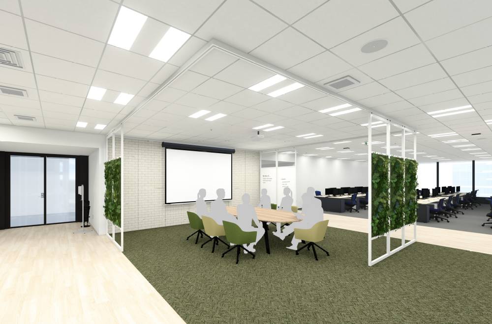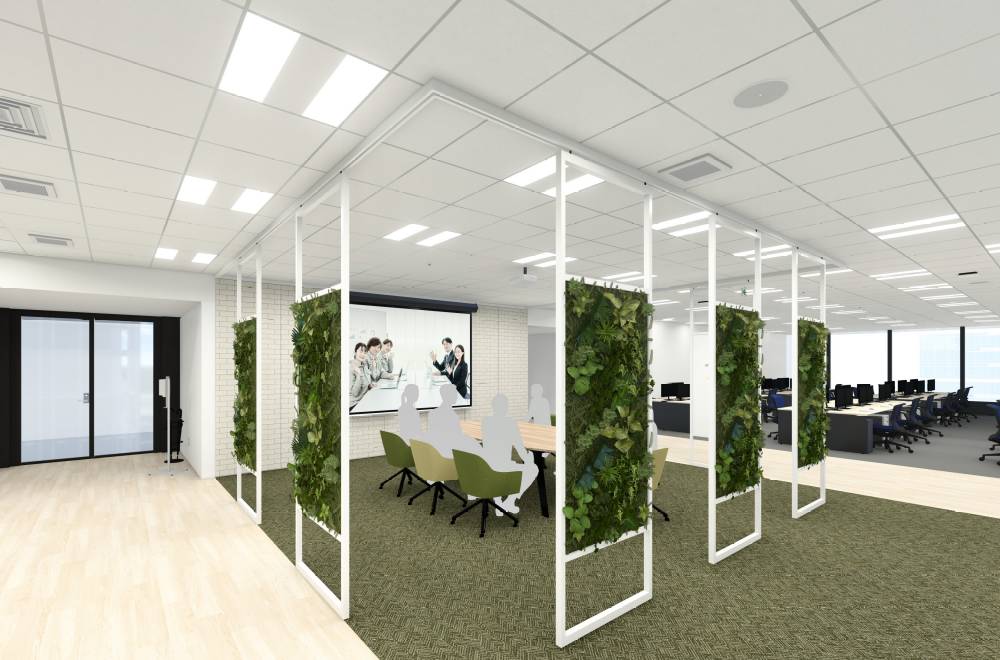 人が行き交う場所の打合せスペースには、グリーンパネルで癒しと自然な囲み感を。