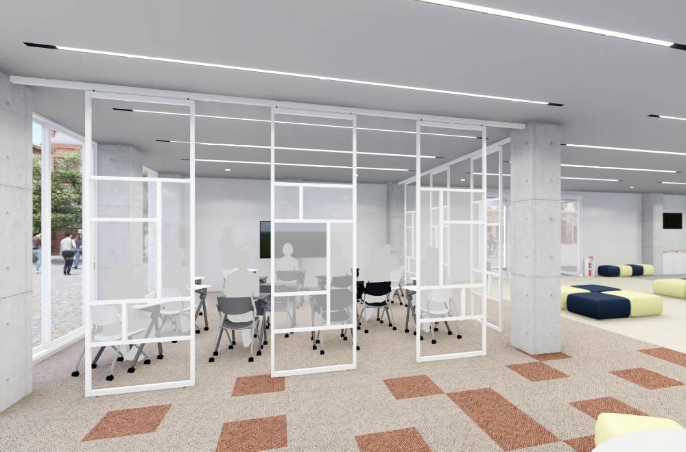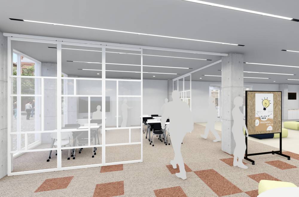 グループ活動や発表会ができるスペースに、モザイクガラスでデザイン性とゾーニング機能を追加。