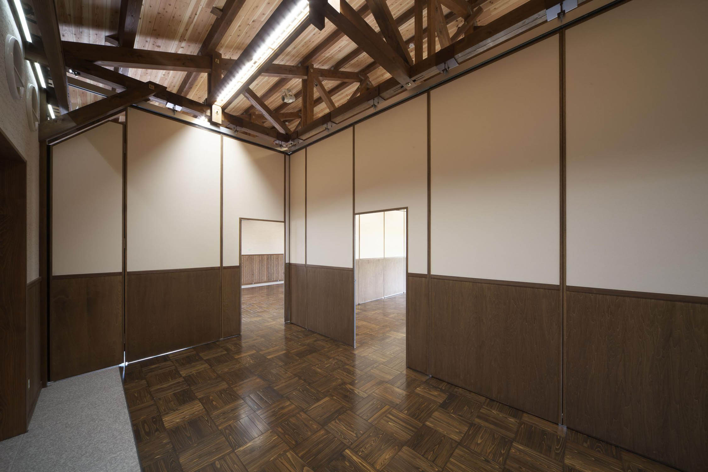 利用目的に合わせてレイアウトの変更が可能です。間仕切られた部屋の入口にはドア付きパネルを使い、部屋の行き来も可能です。