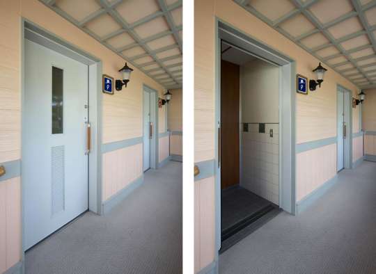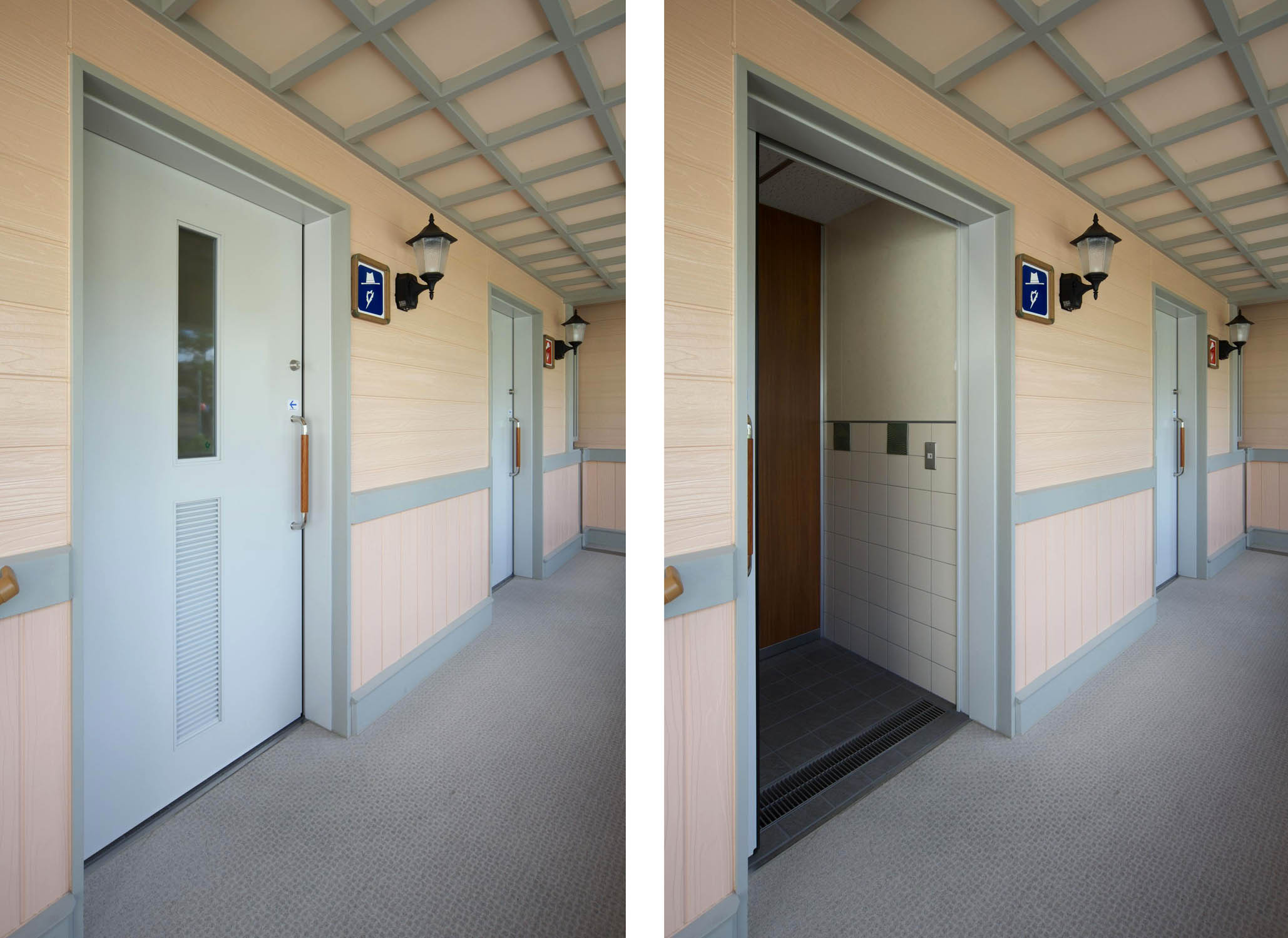 トイレ入り口に設置したドアは床レールが無く、軽い力で開く自閉式のバリアフリーに対応したカームドア。