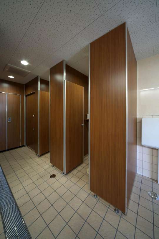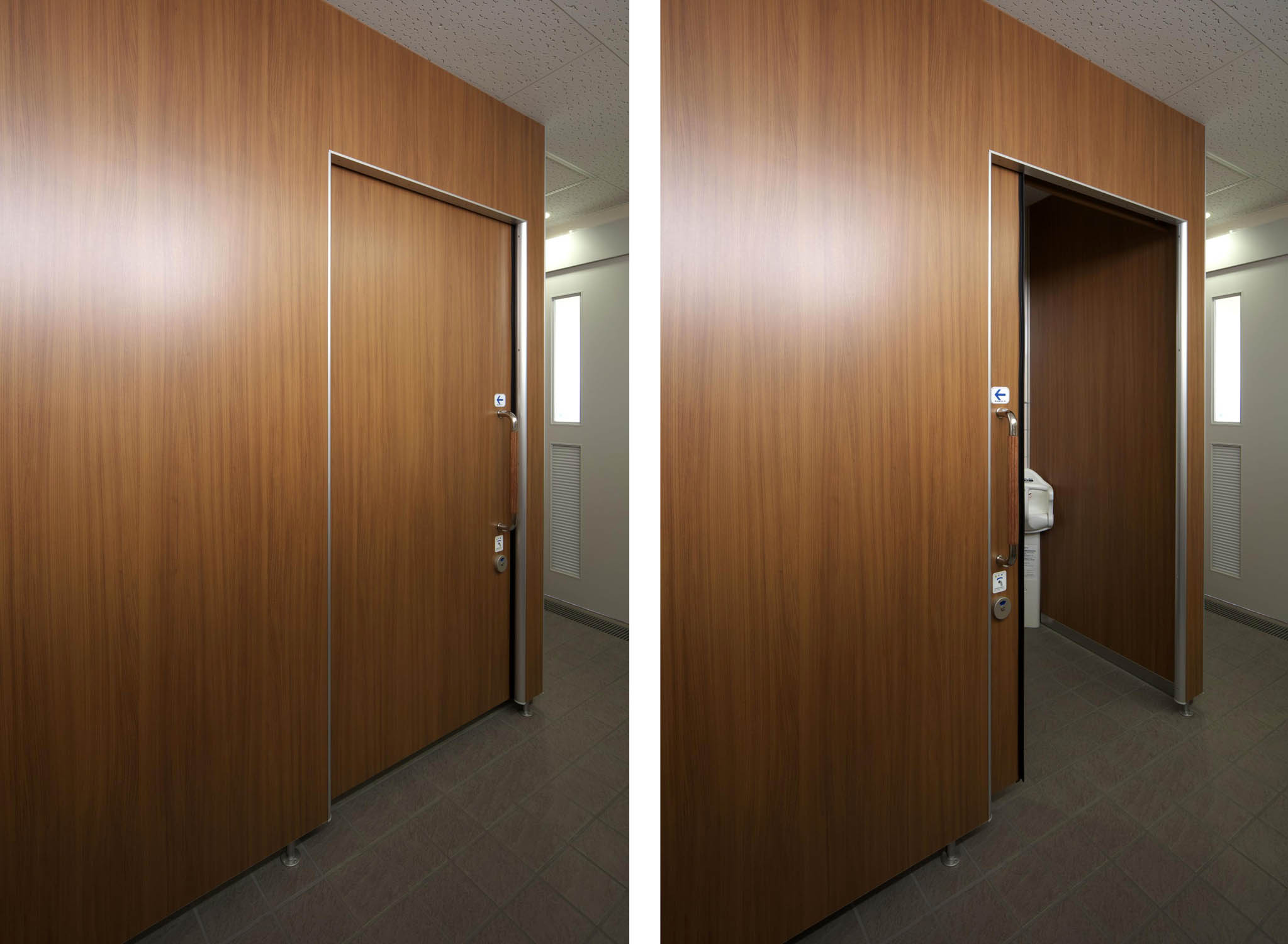 天井までを仕切ることでプライバシーに配慮し、木目とシルバーラインのコントラストが美しいトイレブースに仕上がりました。 非常時には外開きが可能なドア仕様となっており、万が一の時の利用者への配慮も忘れません。