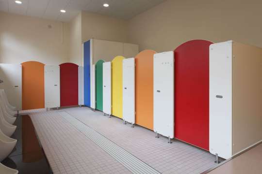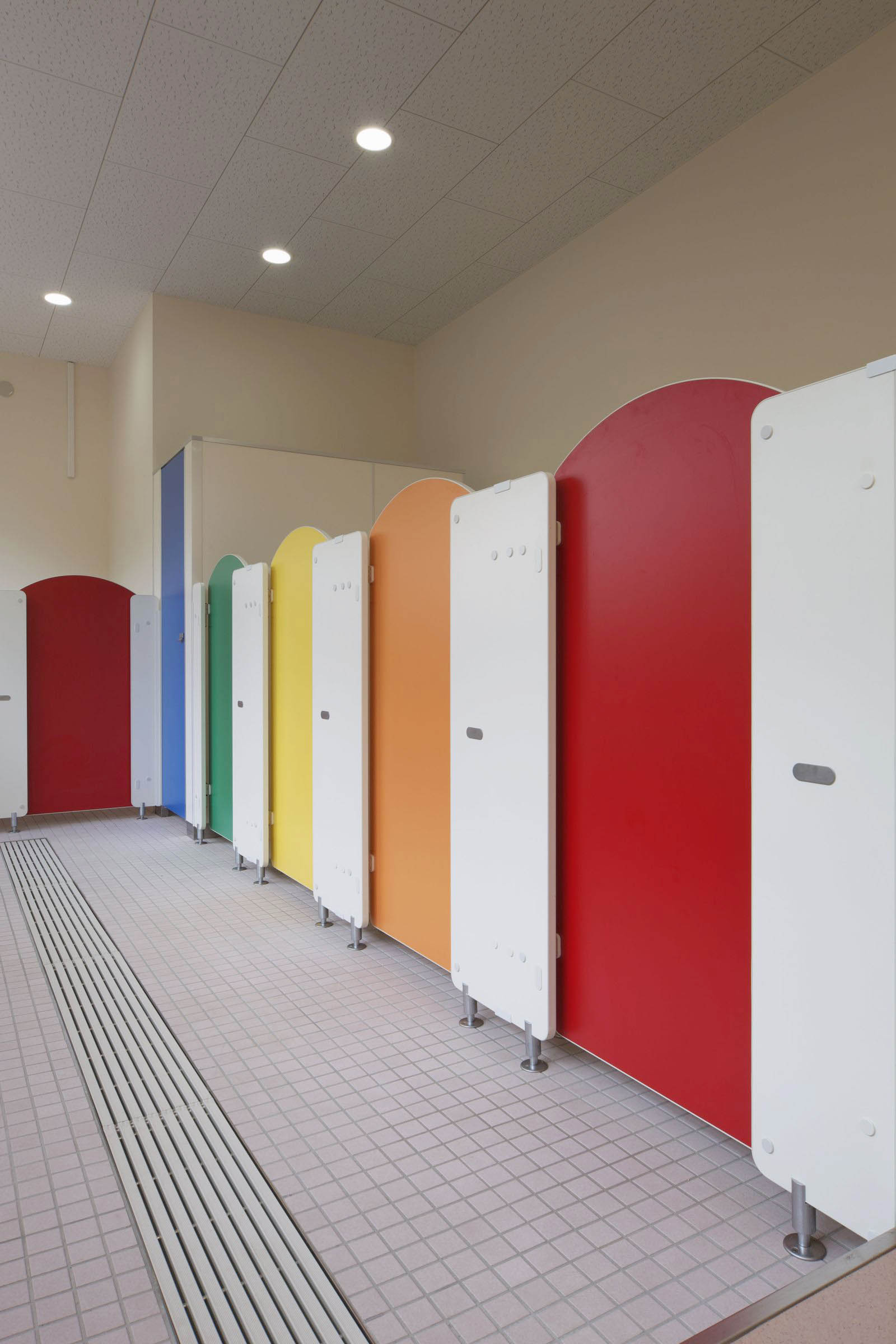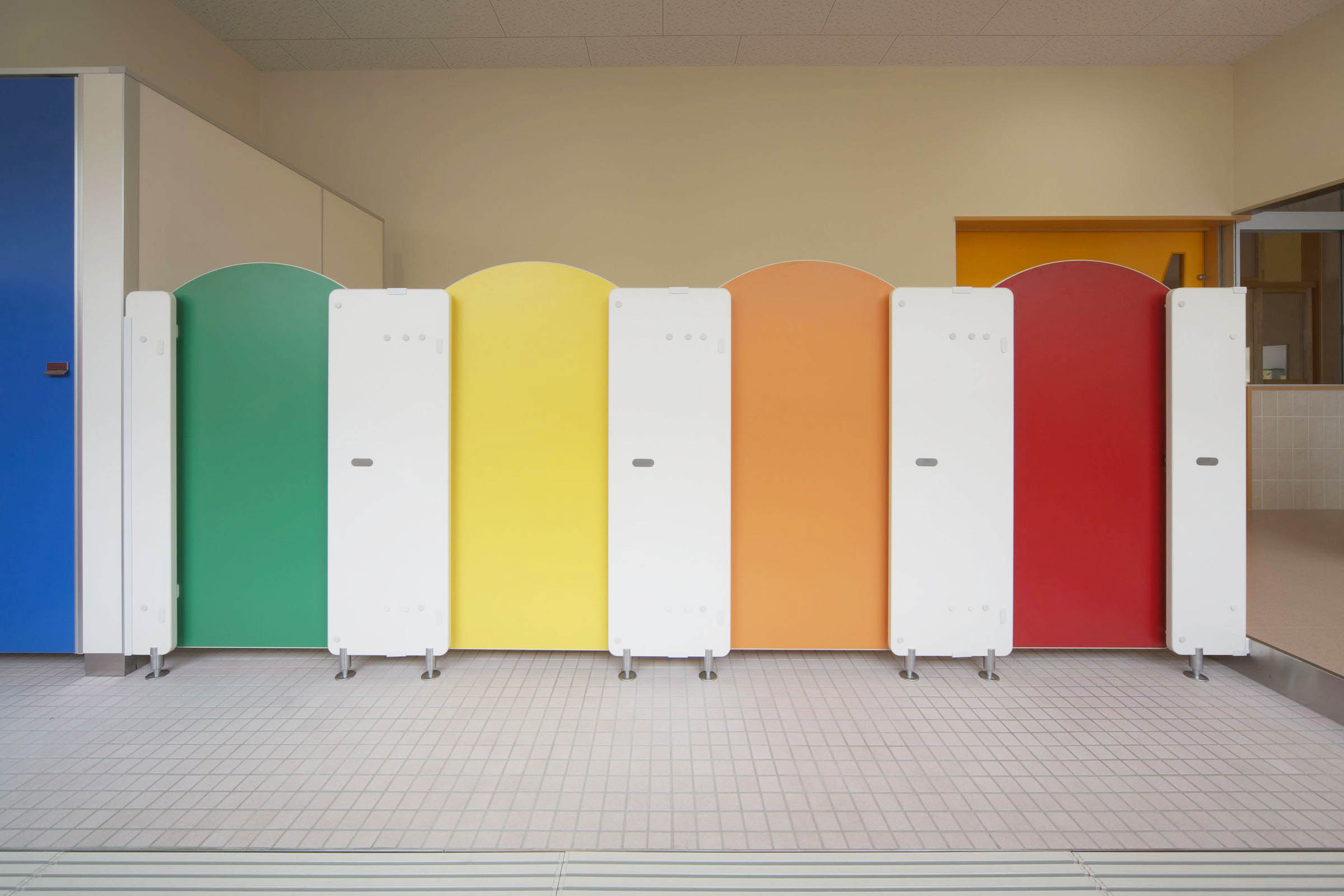 扉は、子供たちが楽しく利用できるようなカラーで、上部をアーチ状にしたトイレブース。