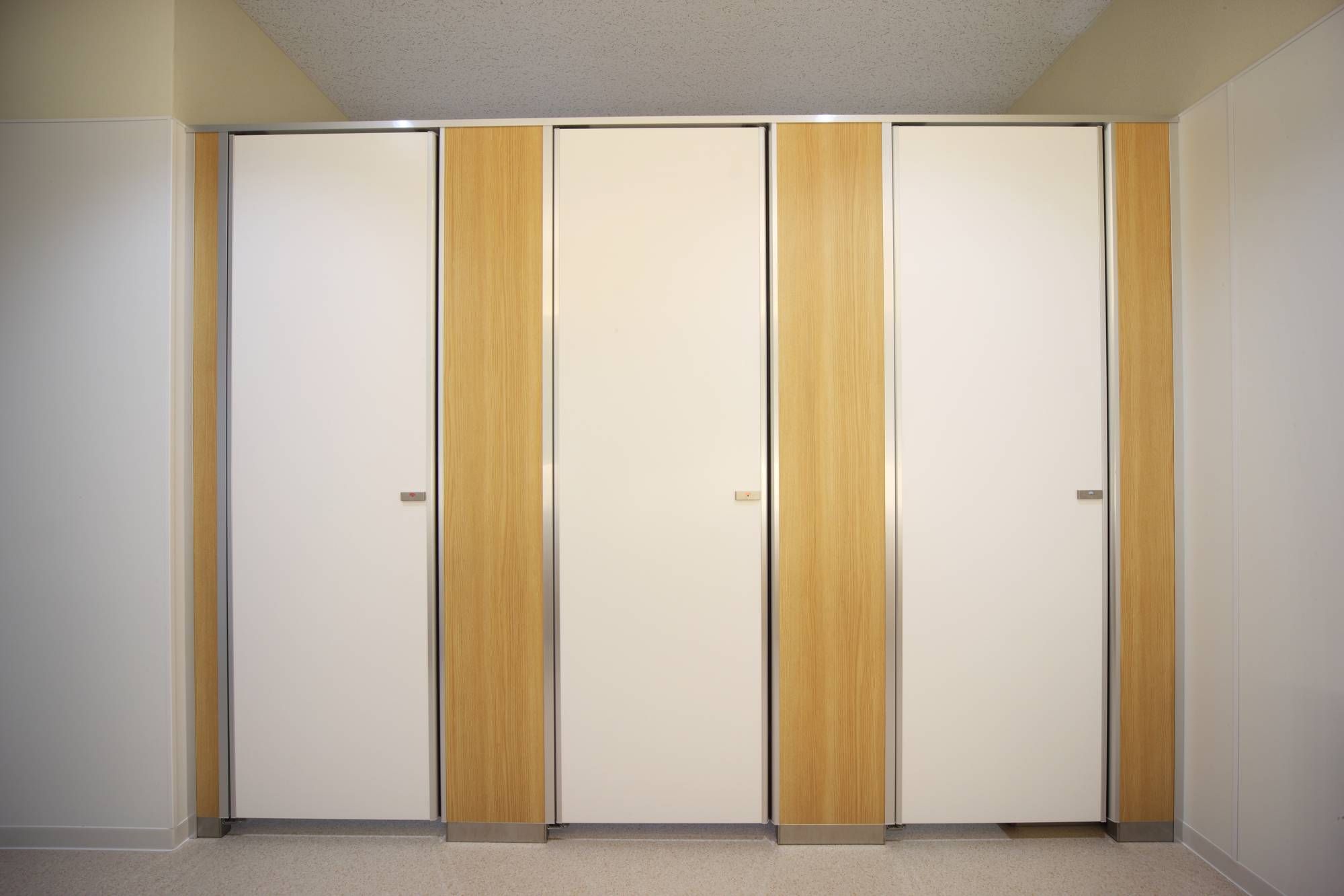 個室を仕切るパネルは30mm厚のパーティクルボードを採用し、非常に堅牢性の高いトイレ空間となっております。