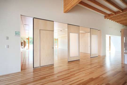 ホールと通路を仕切るライトリーウォールは12枚のパネルで構成し、表面材にシナ合板を、さらに木製の切窓をパネル1枚につき6箇所配置しました。木の温かみが感じられる空間に仕上がりました。