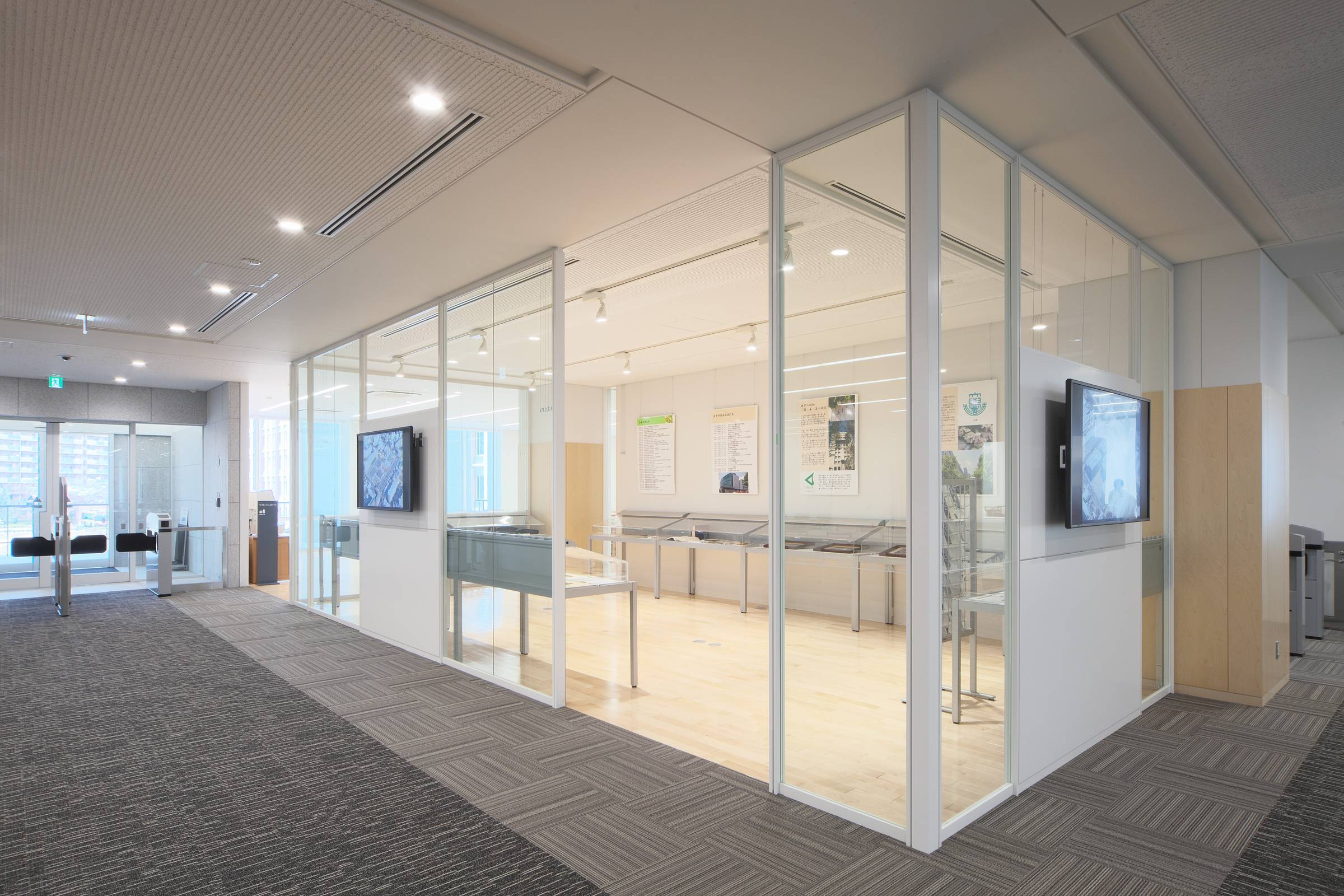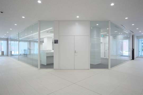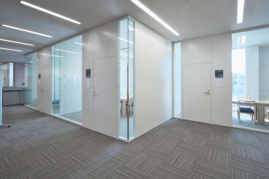 フレームのない遮音タイプのガラスパーティション。