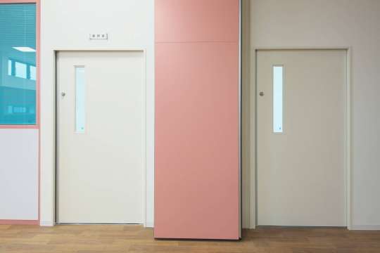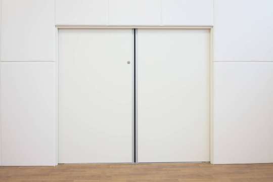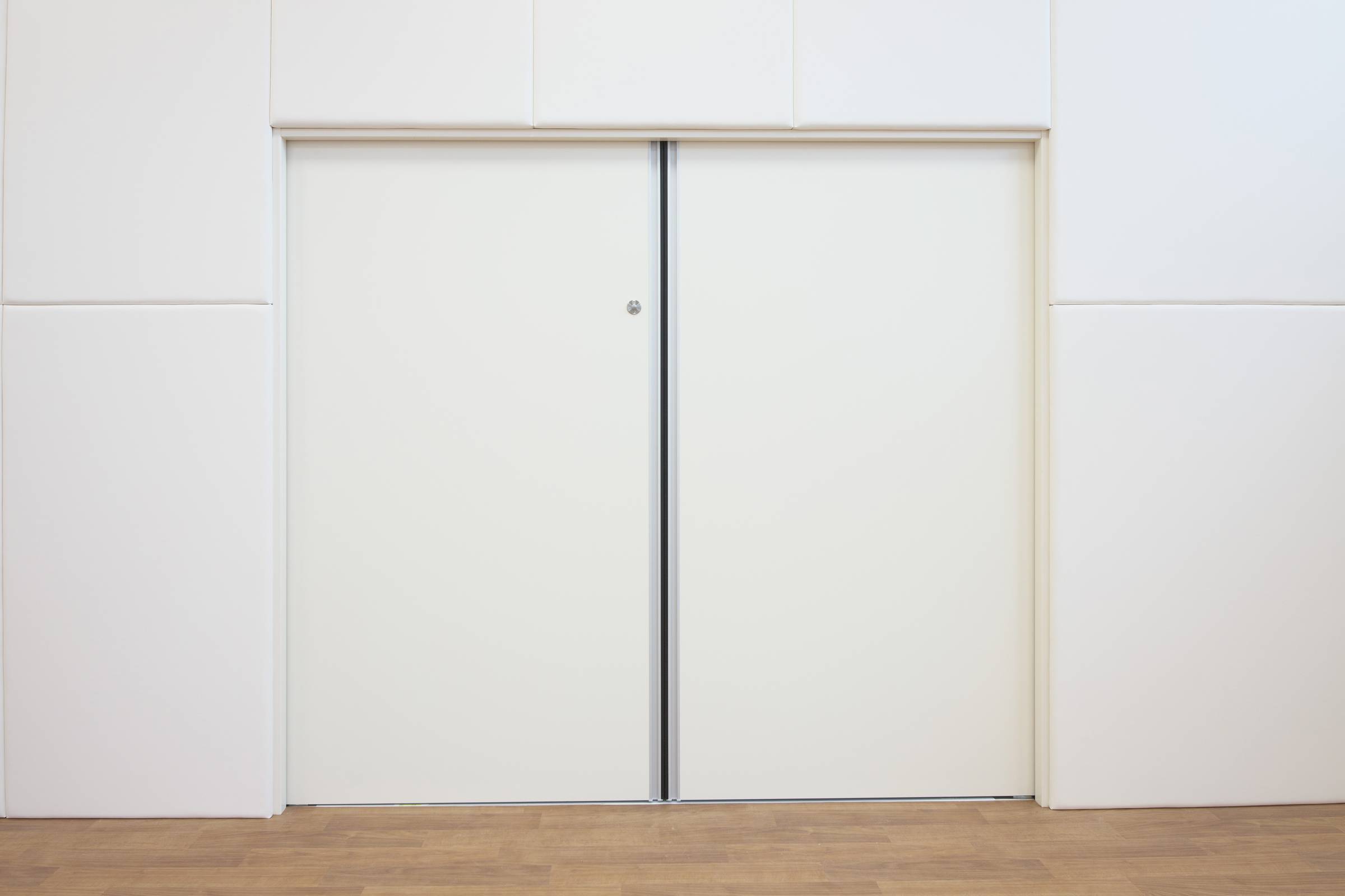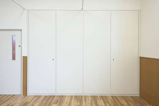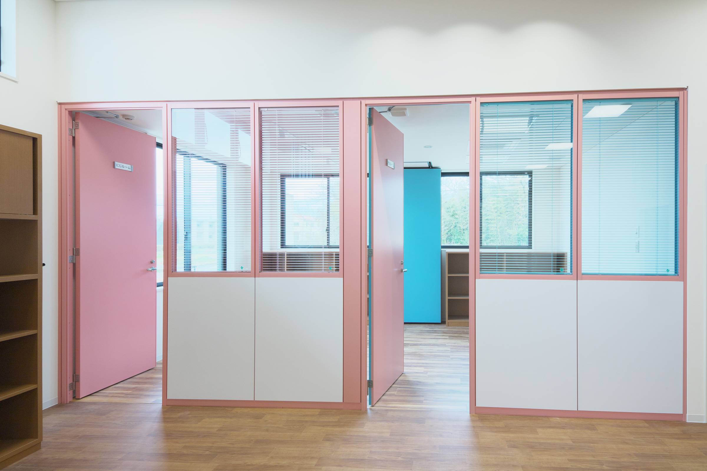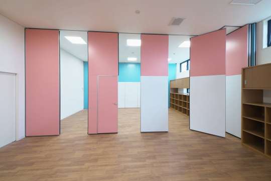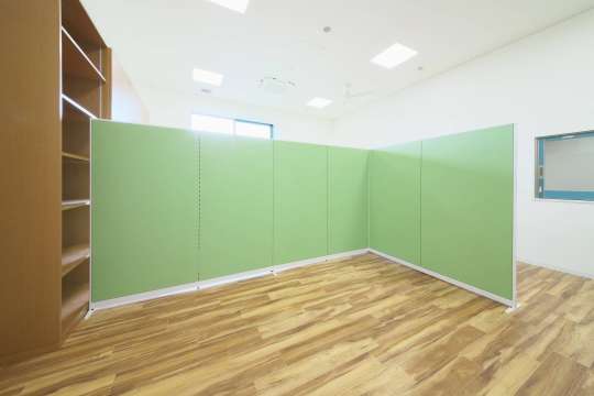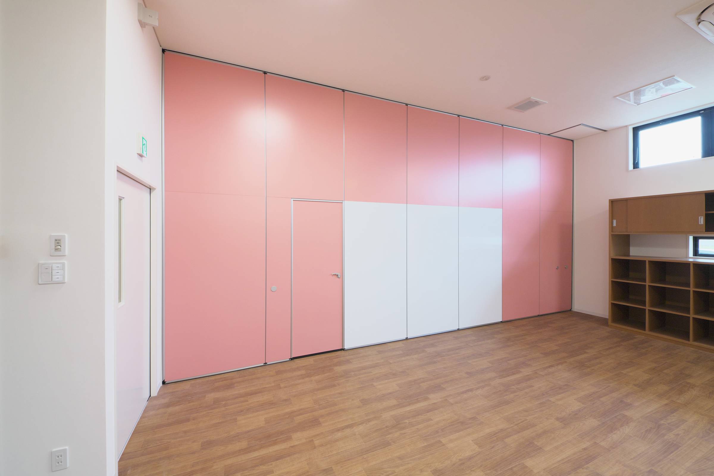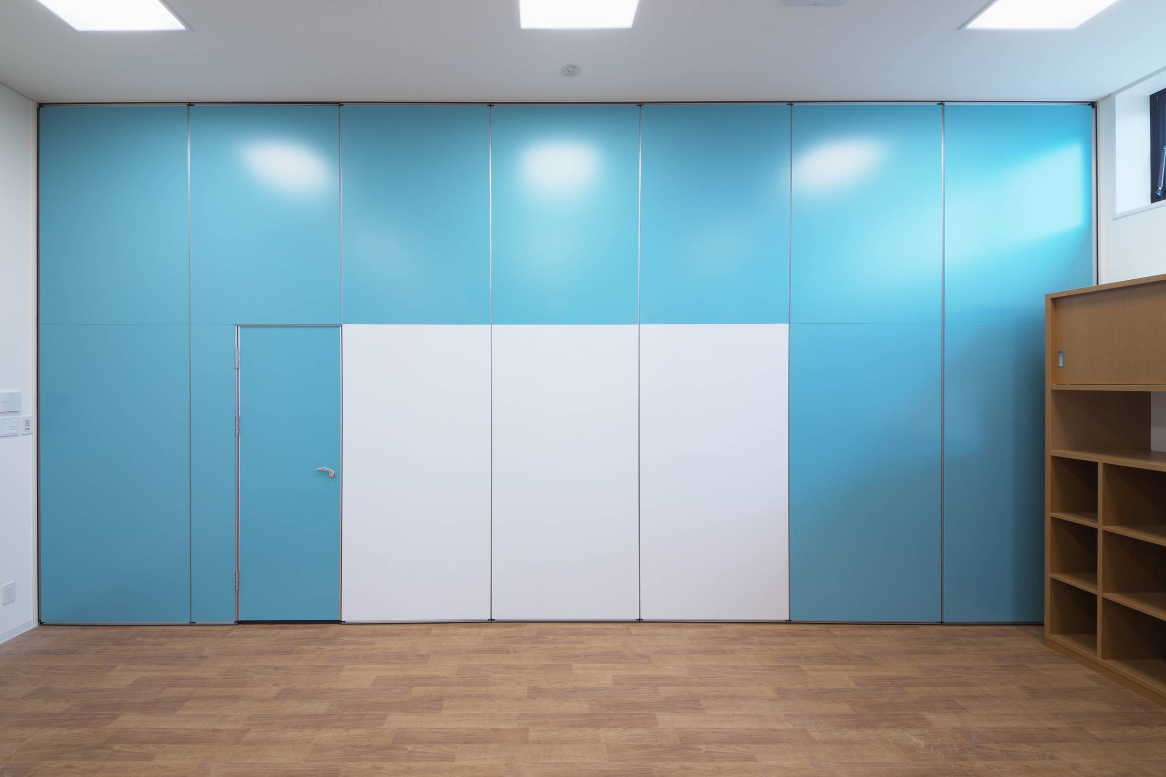 遮音タイプの移動間仕切です一部にホワイトボード鋼板を組み込みました