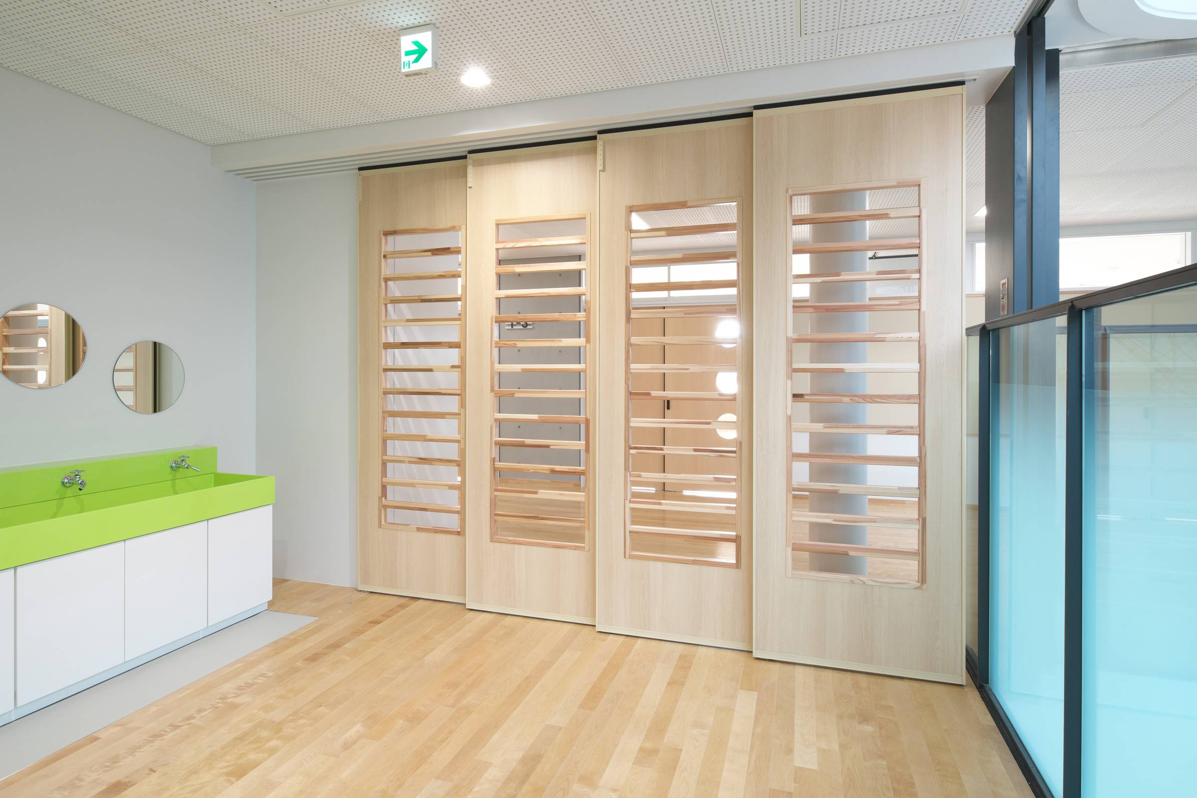 引き戸、サッシ、スチールパネル枠を連結し教室・廊下間を間仕切りました