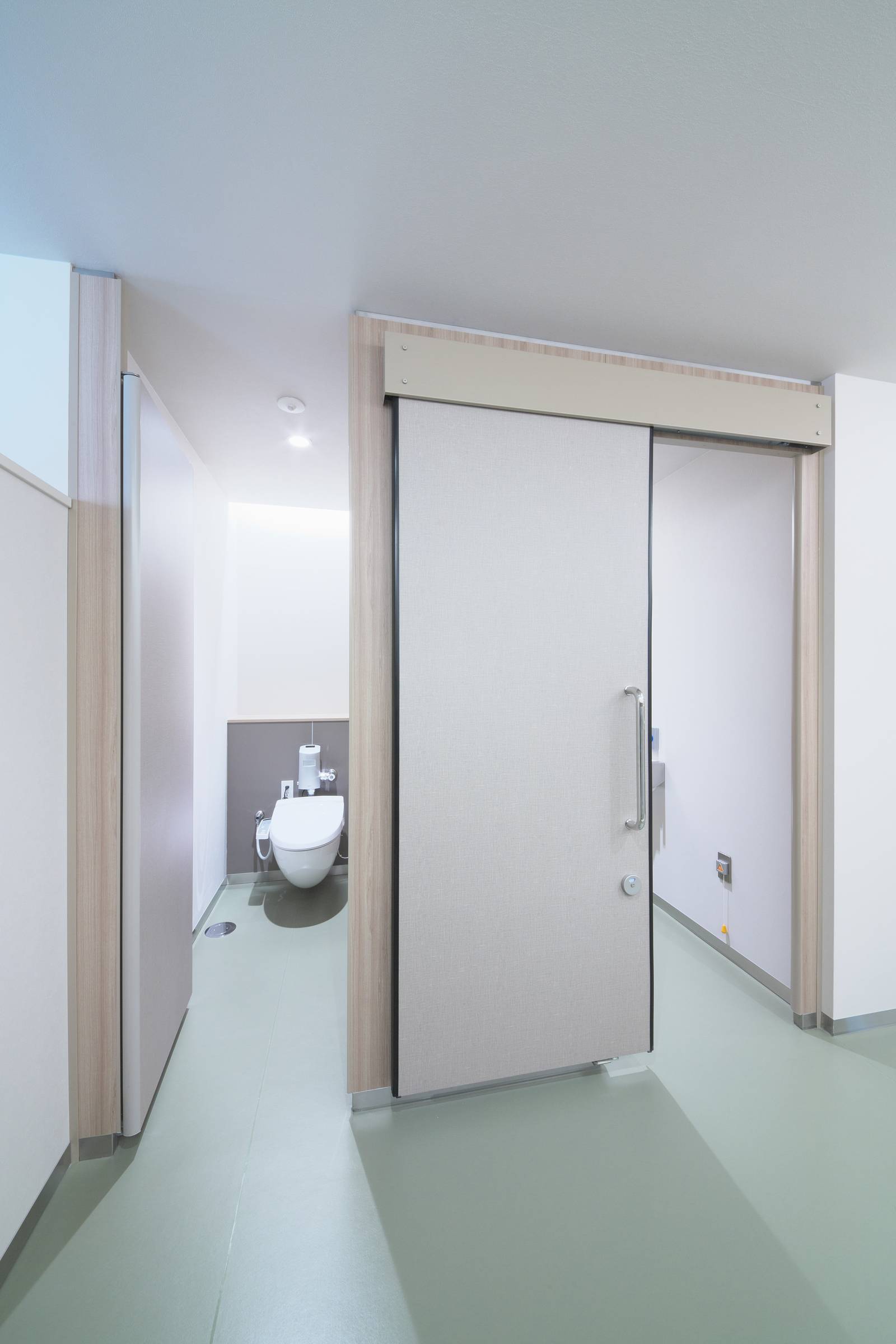 やさしい温かみのある木目調仕上げのトイレブースです