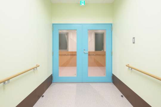 通常は内開きで、非常時に外側に開放できるドアです