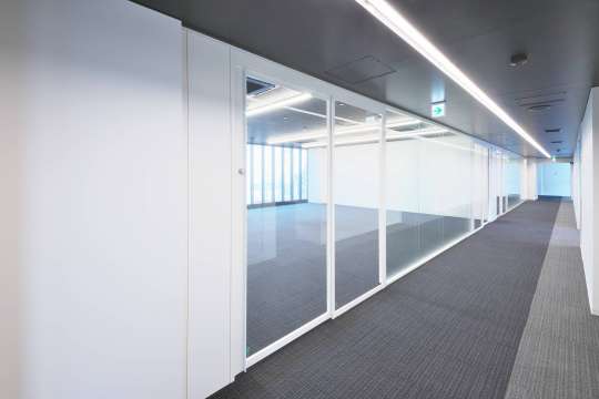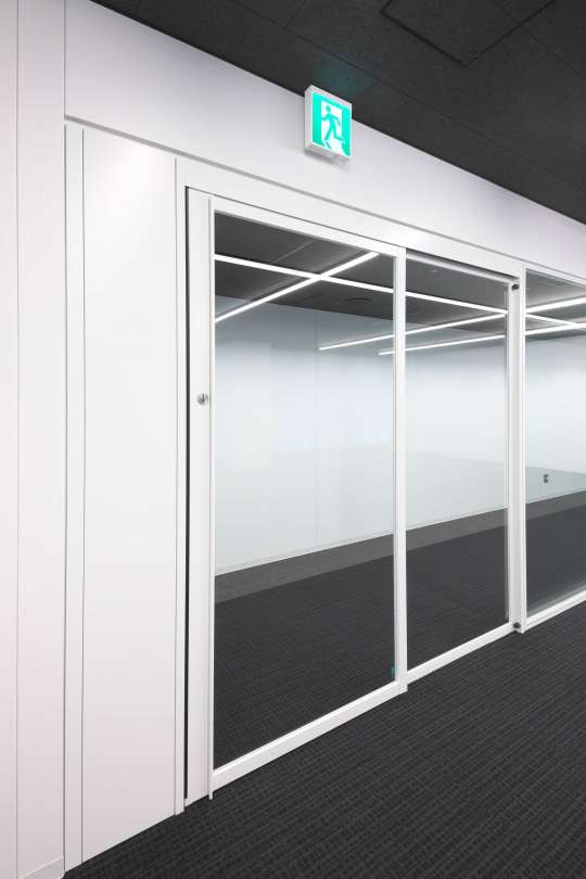 高い遮音性と洗練された美しさが特長のダブルガラスパーティションです。 開放感のあるガラス面の多い吊戸ユニットも採用しました。