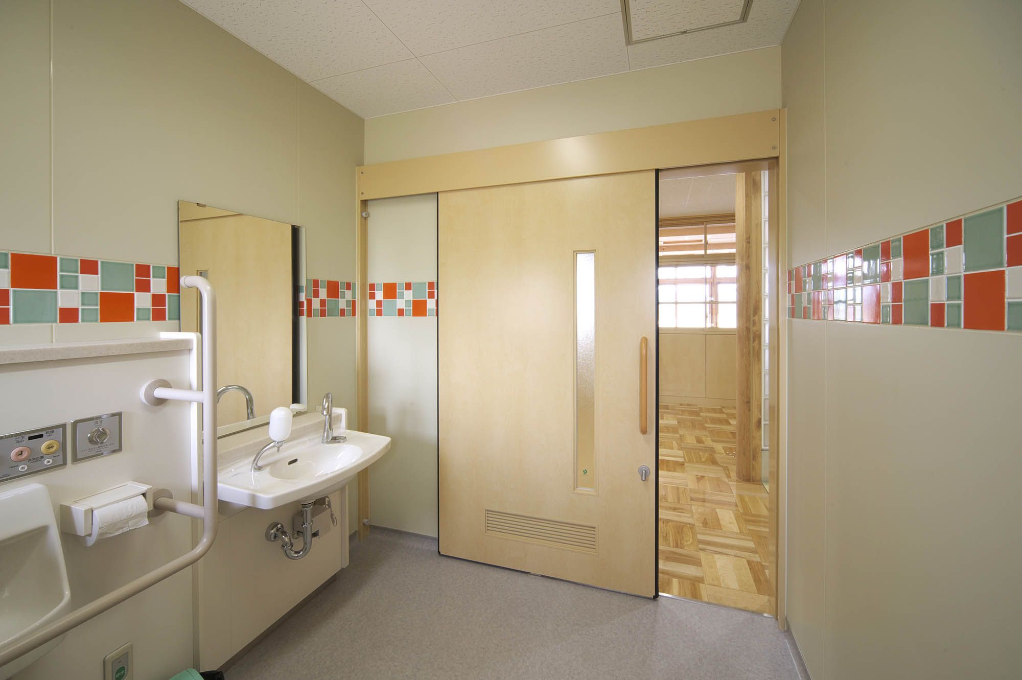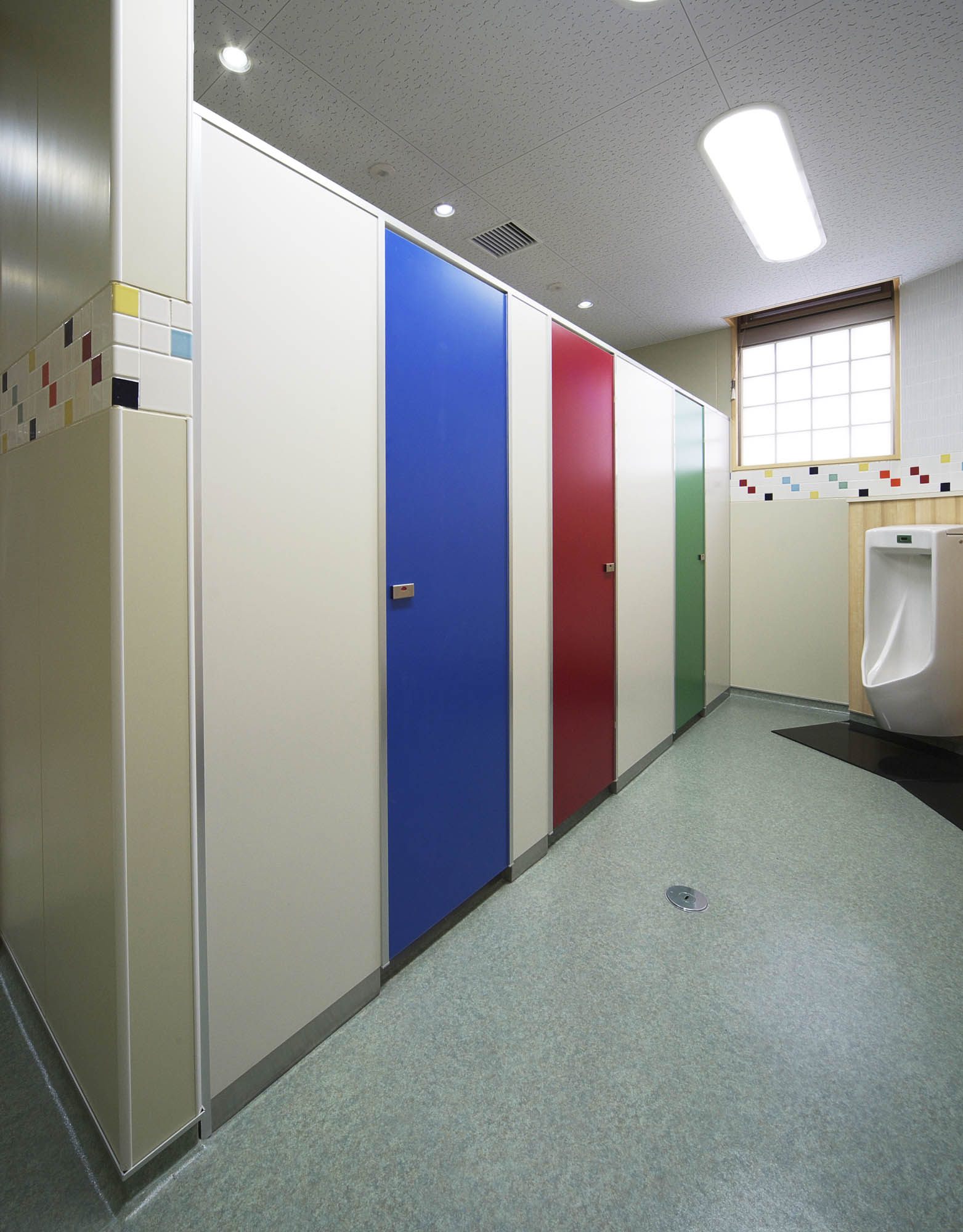 職員用トイレにはシックな木目タイプを、子供達のトイレは明るく開放的な色の扉にしております。