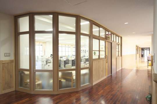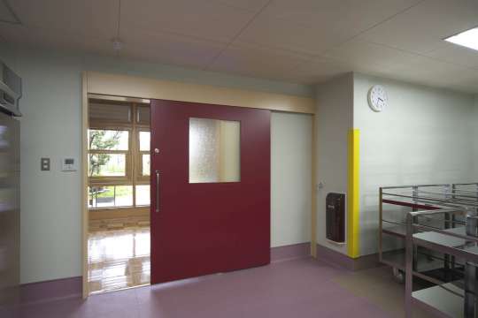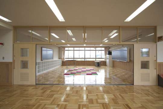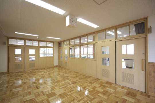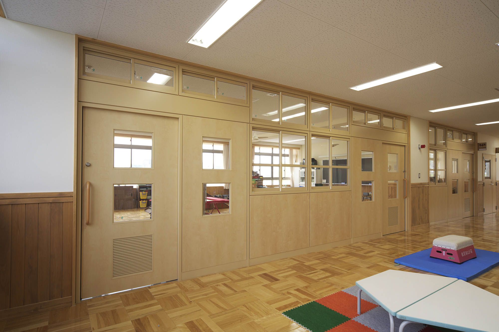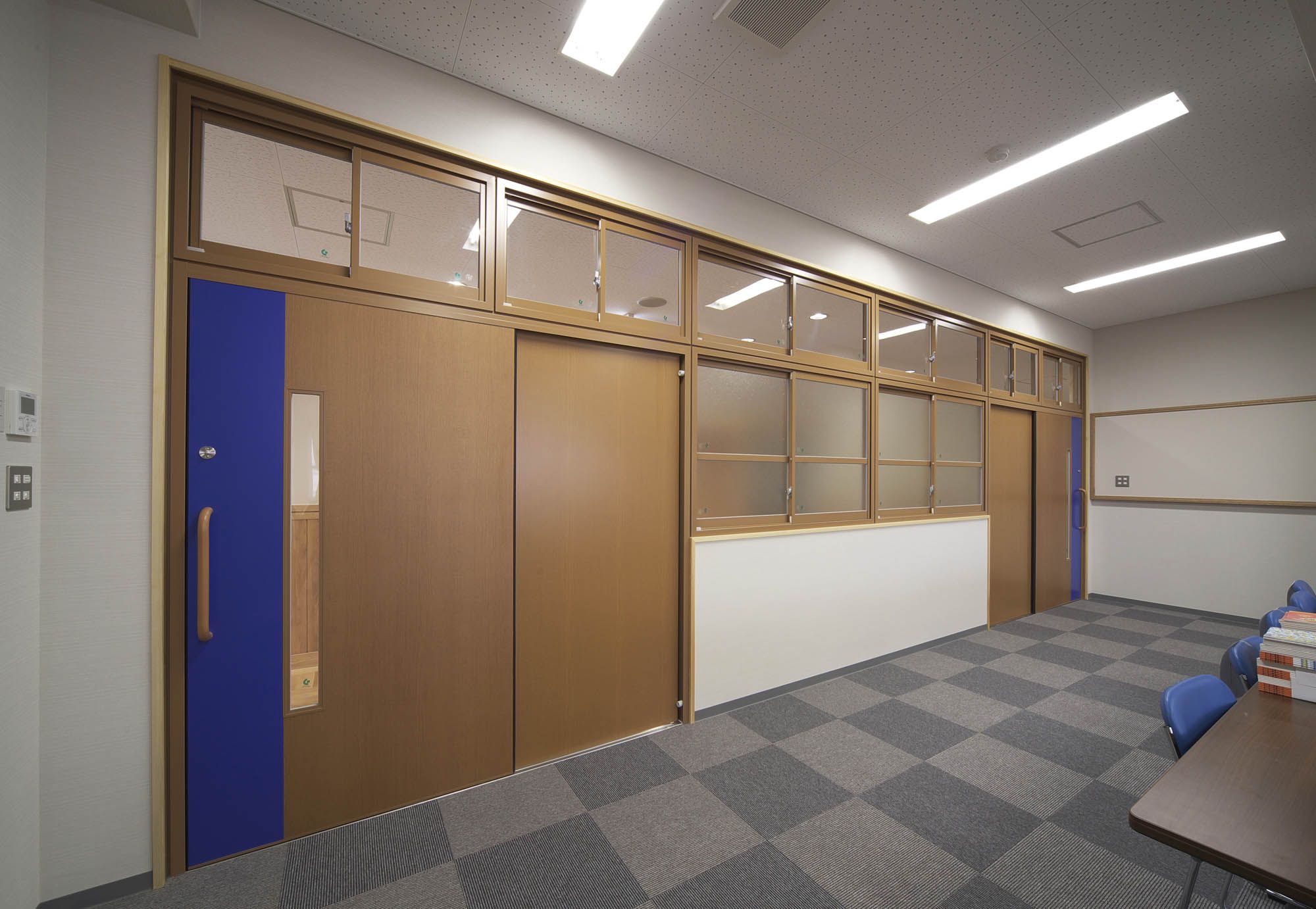 8枚引分け戸タイプの各教室は安全な下レールを採用し、木目鋼板により木の温かみのある雰囲気を演出しています。