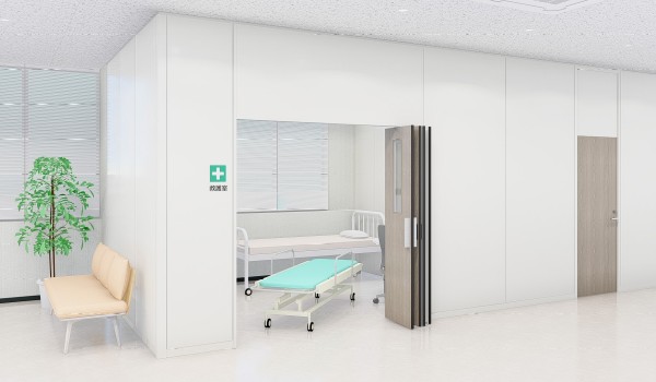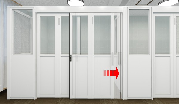 テレスコドアは、通常時は引き戸として使用し、必要に応じてコンパクトに折り畳み、大開口を確保することができる製品です。