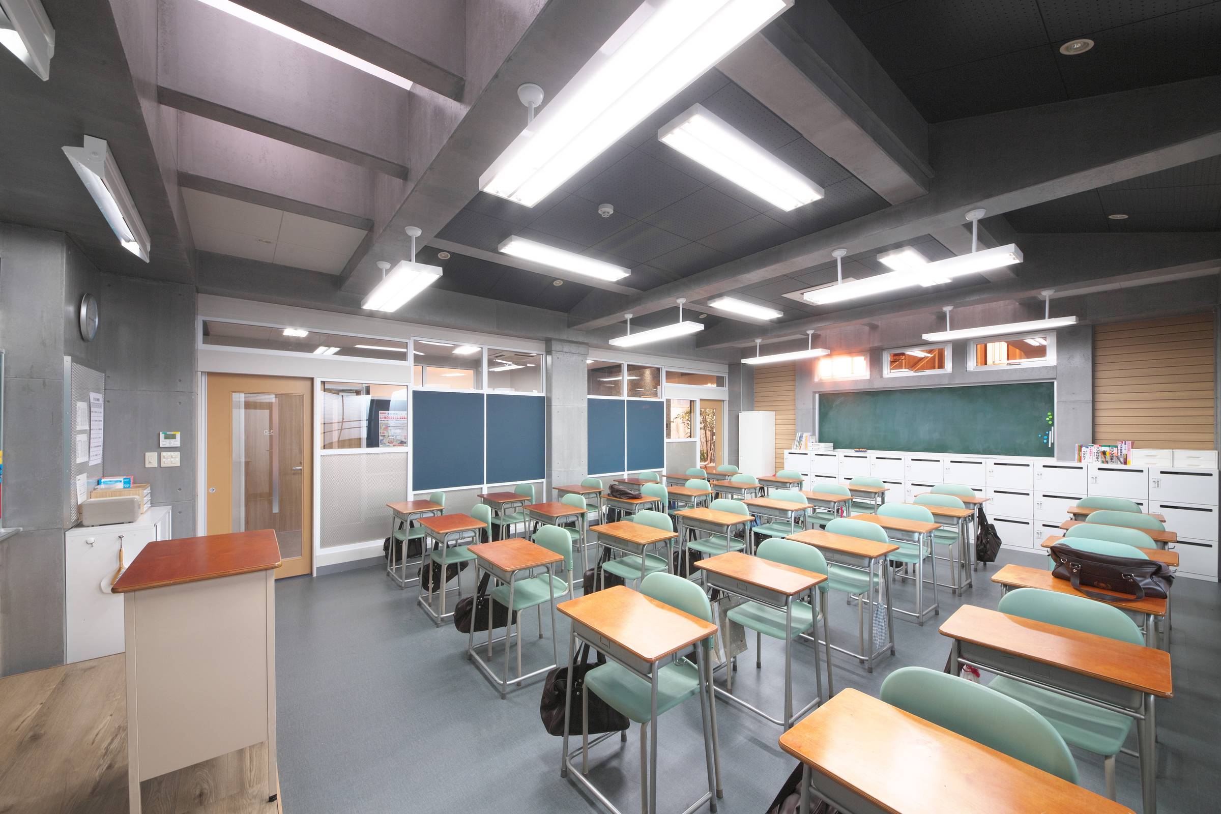 教室の前後出入口のドアに当社の製品カームドアを使用いただきました。
