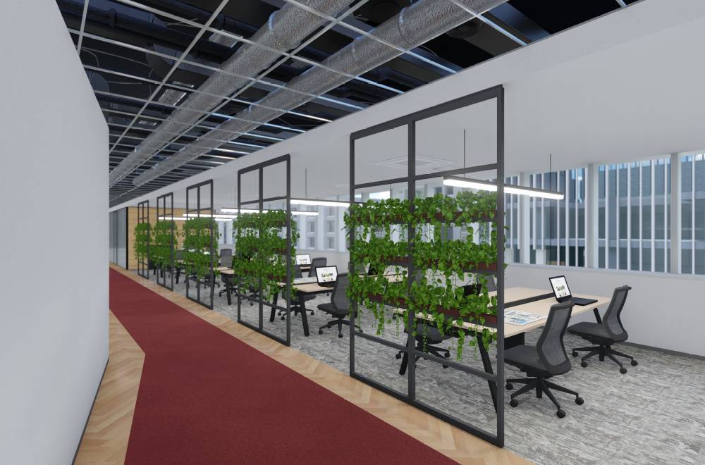 人が行き交う場所の打合せスペースには、グリーンパネルで癒しと自然な囲み感を。