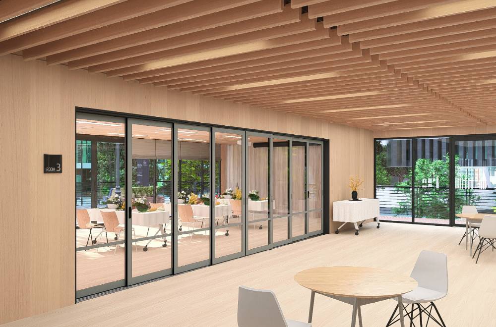 通常は両端の扉を出入口として使用し、必要に応じて多連引戸を端に寄せることで大開口を確保できます。