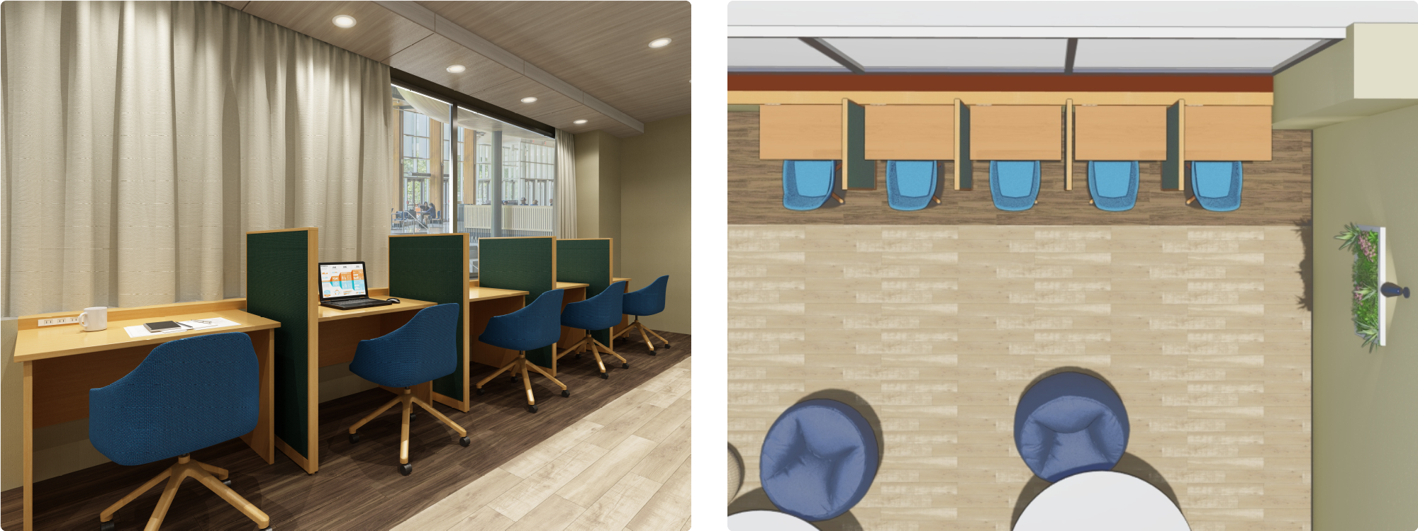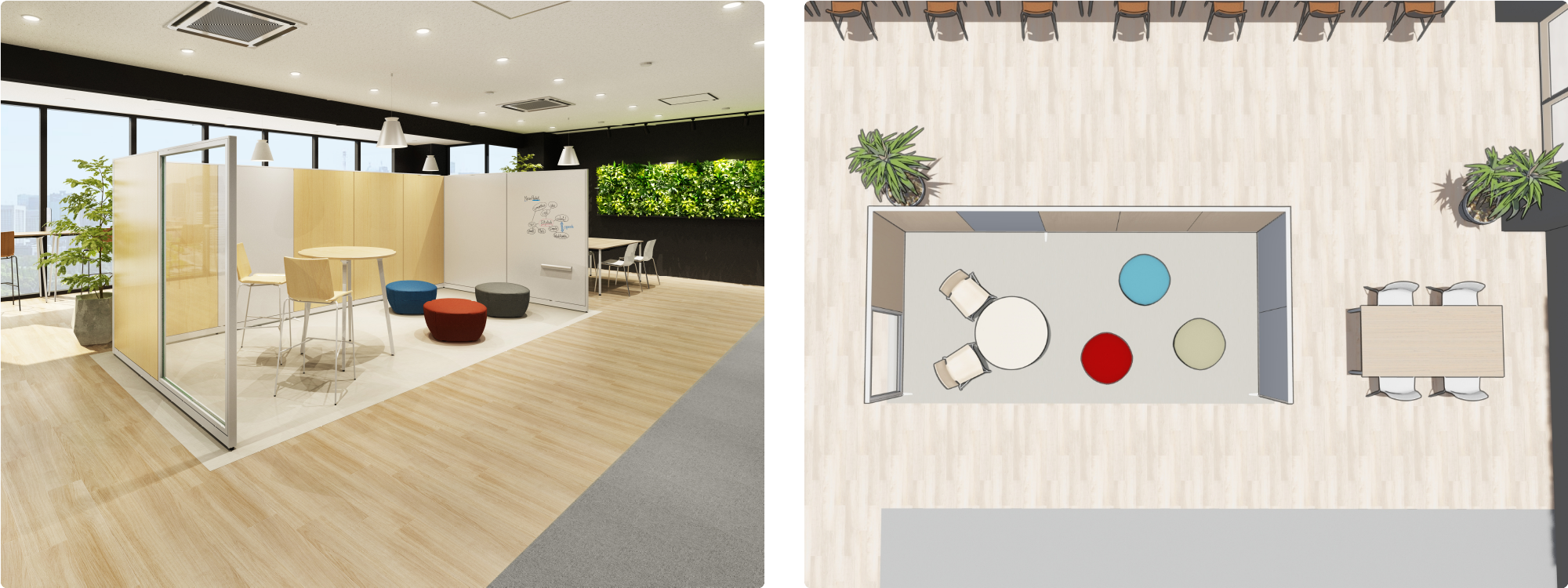 一部分だけを仕切り、ゆったりと気分転換ができるリフレッシュスペースです。