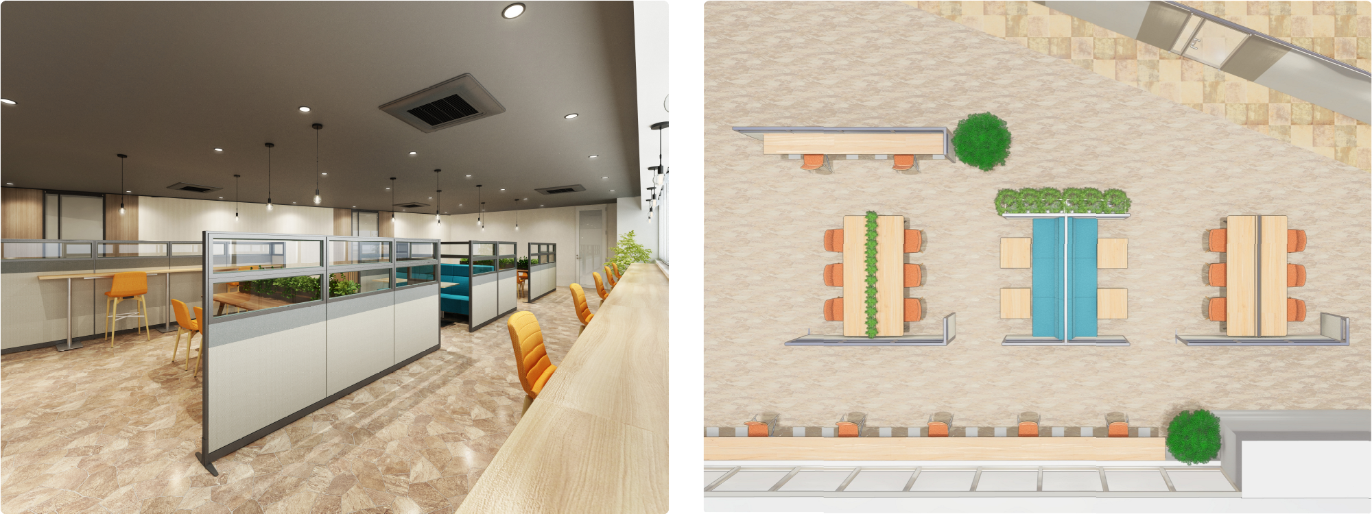 一人分ずつローパーティションで区切ることで個人スペースに。